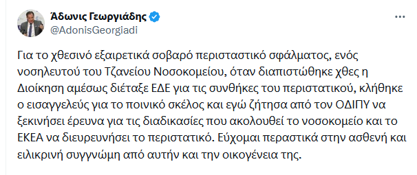 Σύμφωνα με την ανάρτηση του υπουργού Υγείας, Άδωνι Γεωργιάδη, ο ίδιος ζήτησε από τον ΟΔΙΠΥ να ξεκινήσει έρευνα για τις διαδικασίες που ακολουθεί το νοσοκομείο και το ΕΚΕΑ να διερευνήσει το περιστατικό.