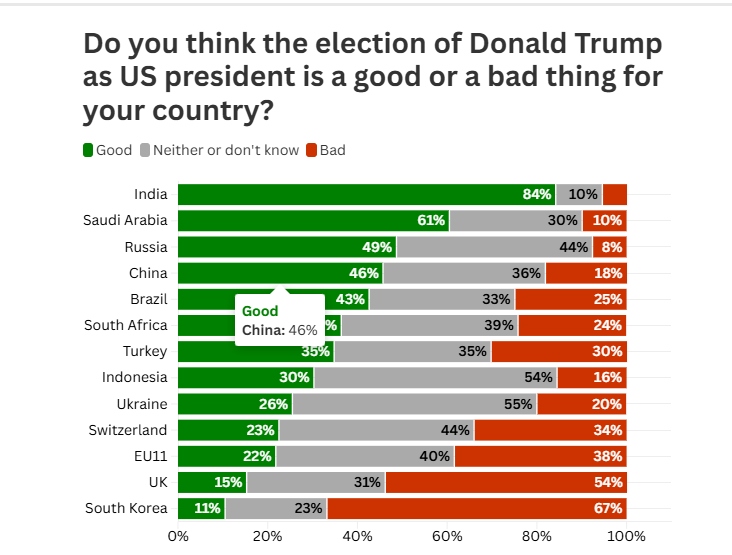 Σχεδόν το 60% των Ρώσων ερωτηθέντων θεωρεί ότι η εκλογή του Τραμπ είναι θετική για τους πολίτες των ΗΠΑ και το 49% θεωρεί ότι είναι καλό για τη Ρωσία. Το 46% των Κινέζων ερωτηθέντων θεωρεί ότι η επιστροφή του Τραμπ θα είναι θετική για την Κίνα, παρά την απειλή του Τραμπ να επιβάλει δασμούς από 60% έως 100% σε αγαθά που εισάγονται από την Κίνα- μια κίνηση που θα μπορούσε να επιφέρει πλήγμα στην κινεζική οικονομία αλλά και να γυρίσει μπούμερανγκ, ανεβάζοντας πιθανότατα τις τιμές για τους Αμερικανούς καταναλωτές.
