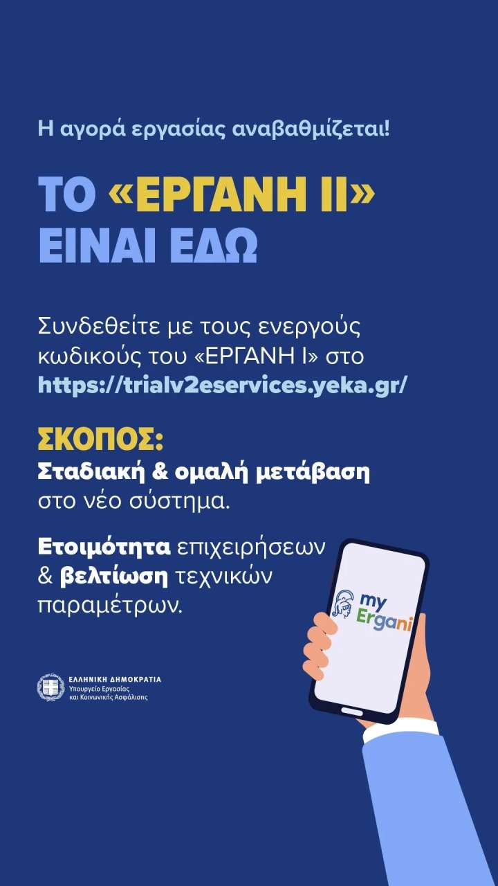 - Το «ΕΡΓΑΝΗ ΙΙ» είναι η νέα έκδοση του πληροφοριακού συστήματος του Υπουργείου Εργασίας και Κοινωνικής Ασφάλισης, που τίθεται σε δοκιμαστική λειτουργία την Πέμπτη, 10 Απριλίου 202