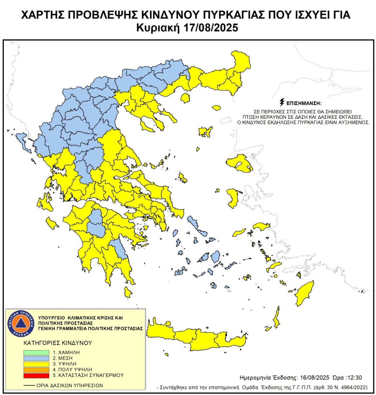 Ο Χάρτης Επικινδυνότητας που εκδίδει η Γενική Γραμματεία Πολιτικής Προστασίας του Υπουργείου Κλιματικής Κρίσης & Πολιτικής Προστασίας προβλέπει για αύριο Κυριακή (17/8) ότι θα υπάρχει υψηλός κίνδυνος πυρκαγιάς σε αρκετές περιοχές της χώρας.