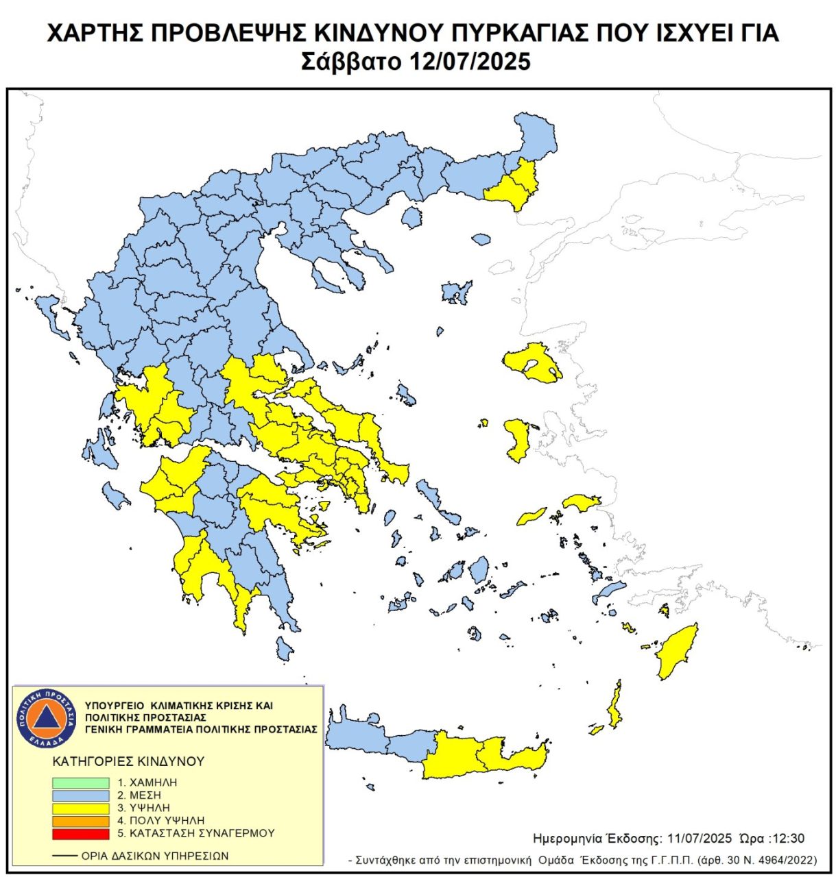 Στην κατηγορία κινδύνου 3 (υψηλός κίνδυνος πυρκαγιάς) κατατάσσονται σήμερα, Σάββατο 12 Ιουλίου, η Αττική, η Εύβοια, η Κορινθία, η Αργολίδα, η Μεσσηνία και άλλες περιοχές, σύμφωνα με τον Χάρτη Πρόβλεψης Κινδύνου Πυρκαγιάς της Γενικής Γραμματείας Πολιτικής Προστασίας του Υπουργείου Κλιματικής Κρίσης και Πολιτικής Προστασίας (civilprotection.gov.gr).