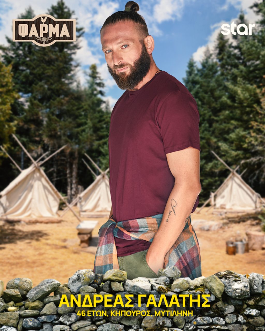 Ο Ανδρέας είναι γέννημα θρέμμα Μυτιληνιός και «έχτισε» όλη του τη ζωή στο νησί. Κηπουρός σε θερμοκήπια και χωράφια, αλλά και μάνατζερ στο χώρο της εστίασης, καθημερινά εργάζεται σκληρά για να μη λείψει τίποτα από τη σύζυγο και τις δύο του κόρες. Αυτές είναι και ο λόγος που έρχεται στη Φάρμα με σκοπό τη νίκη.