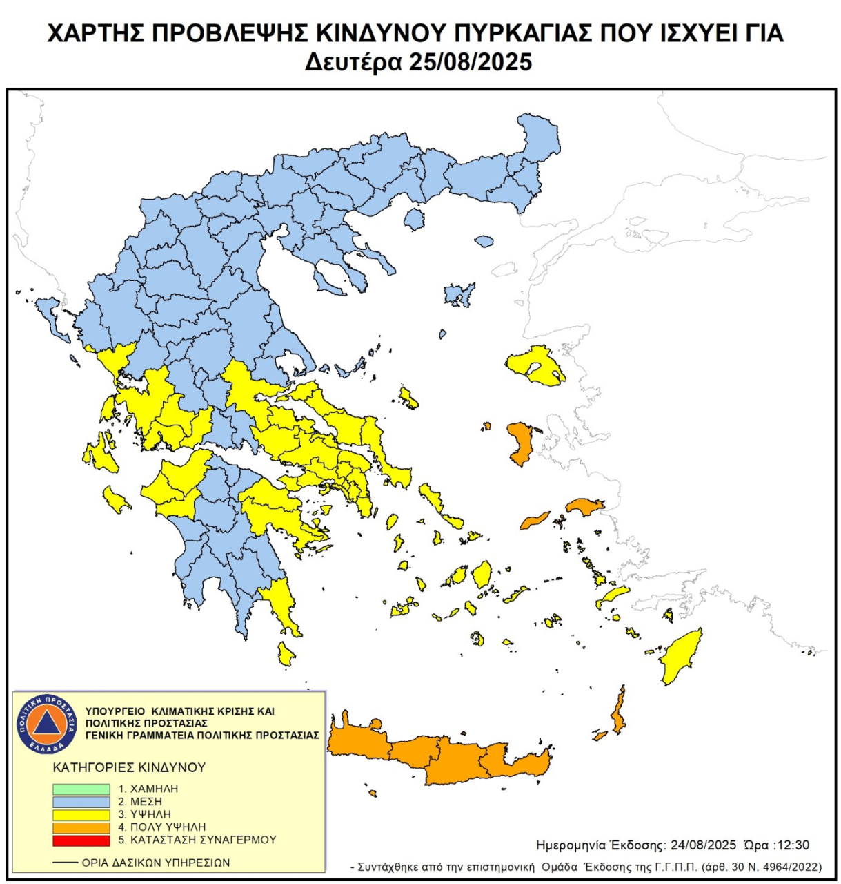 Σύμφωνα με το Χάρτη Πρόβλεψης Κινδύνου Πυρκαγιάς που εκδίδει η Γενική Γραμματεία Πολιτικής Προστασίας του Υπουργείου Κλιματικής Κρίσης & Πολιτικής Προστασίας για σήμερα Δευτέρα 25 Αυγούστου 2025, προβλέπεται πολύ υψηλός κίνδυνος πυρκαγιάς (κατηγορία κινδύνου 4) για τις εξής περιοχές: