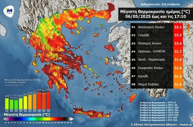 Όπως φαίνεται στην εικόνα που έδωσε στην δημοσιότητα το meteo.gr/Εθνικό Αστεροσκοπείο Αθηνών, οι υψηλότερες θερμοκρασίες σε όλη τη χώρα σημειώθηκαν στην Κρήτη, καθώς σε πολλές περιοχές ο υδράργυρος έσπασε το φράγμα των 30 βαθμών Κελσίου.