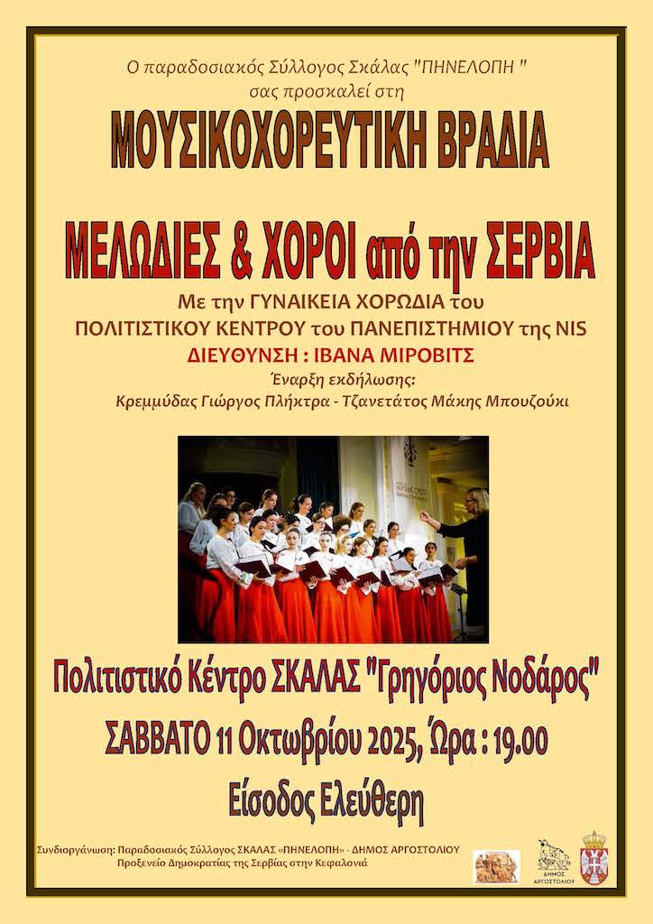 Συνδιοργάνωση: Παραδοσιακός Σύλλογος ΣΚΑΛΑΣ «ΠΗΝΕΛΟΠΗ» – ΔΗΜΟΣ ΑΡΓΟΣΤΟΛΙΟΥ- Προξενείο Δημοκρατίας της Σερβίας στην Κεφαλονιά