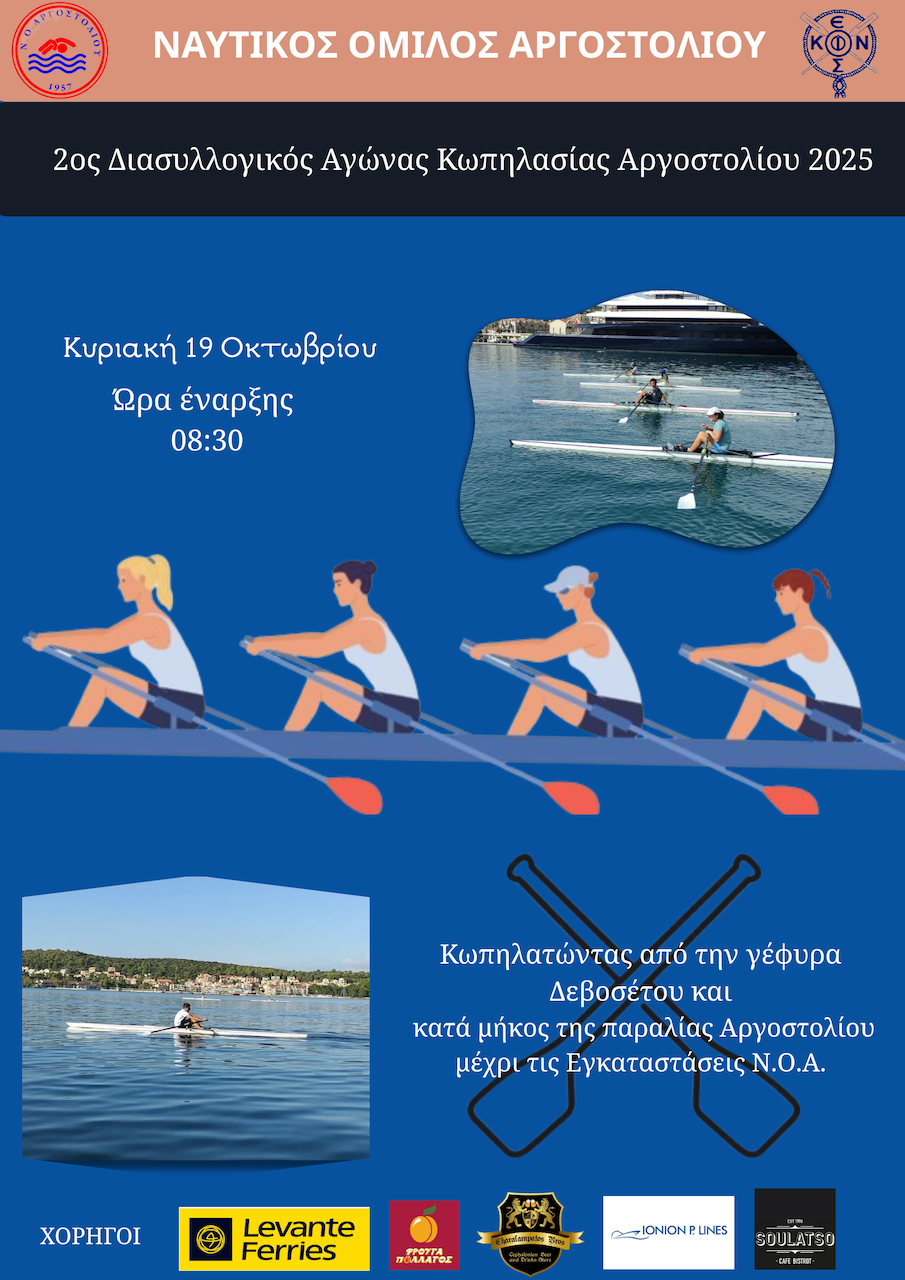 Ο Ναυτικός Όμιλος Αργοστολίου σας προσκαλεί να τιμήσετε με την παρουσία σας τον 2ο Διασυλλογικό Αγώνα Κωπηλασίας την Κυριακή 19 Οκτωβρίου 2025 στις 09:00 π.μ. έως τις 11:30 π.μ. στις εγκαταστάσεις του Ν.Ο.Αργοστολίου.