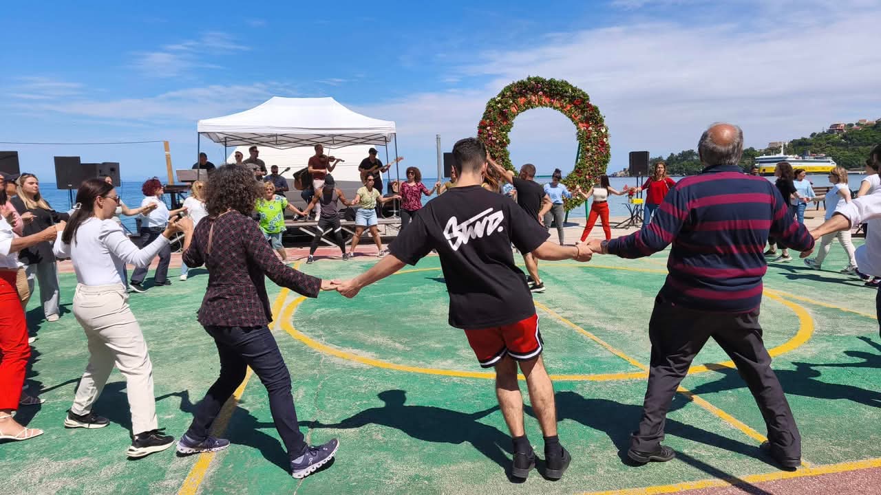 Ενδιάμεσα, το απόγευμα, η χορευτική ομάδα του πολιτιστικού συλλόγου του Πόρου Κεφαλονιάς “Ο Πρόνησος” και το Πολυφωνικό-Χορευτικό Συγκρότημα “Grupi Ergjeria” από το Αργυρόκαστρο διασκεύασαν και ένωσαν στο τέλος το κοινό στο χορό!