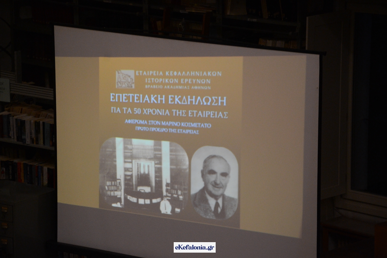Με μια ξεχωριστή επετειακή εκδήλωση στην Κοργιαλένειο Βιβλιοθήκη Αργοστολίου, την Τρίτη 2 Σεπτεμβρίου 2025, η Εταιρεία Κεφαλληνιακών Ιστορικών Ερευνών τίμησε τα πενήντα χρόνια από την ίδρυσή της, αφιερώνοντας τη βραδιά στον πρώτο πρόεδρό της, τον Μαρίνο Φωκά-Κοσμετάτο (1905-2004).