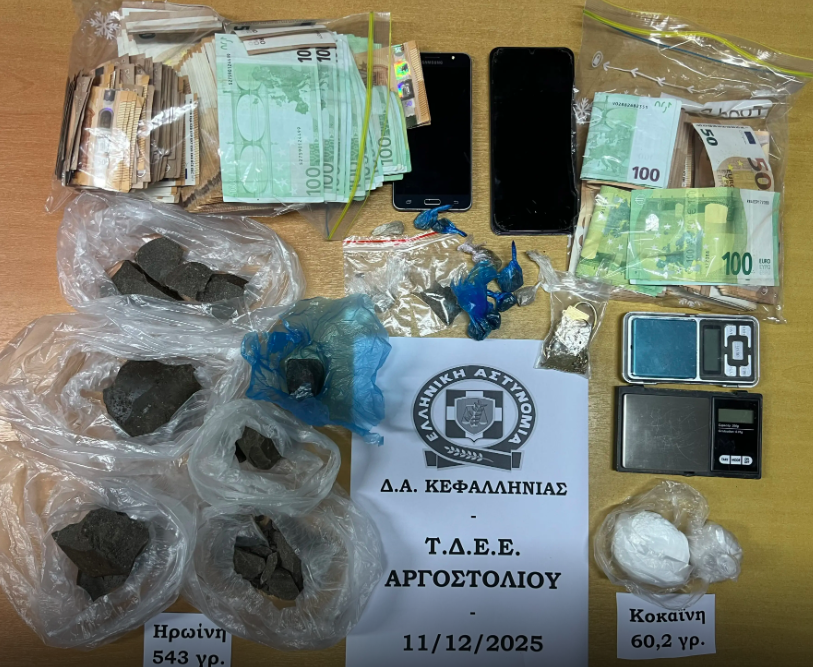 Μεγάλο χτύπημα της ΕΛ.ΑΣ. στην Κεφαλονιά: Πάνω από μισό κιλό ηρωίνης και σχεδόν 26.000 ευρώ