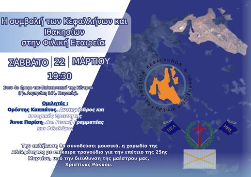 Η Αδελφότητα Κεφαλλήνων και Ιθακησίων Πειραιά σας προσκαλεί το Σάββατο 22 Μαρτίου, στις 19:30 στον 4o όροφο του Πολιτιστικού μας Κέντρου (Γρ. Λαμπράκη 144, Πειραιάς) στην εκδήλωση «Η συμβολή των Κεφαλλήνων και Ιθακήσιων στην Φιλική Εταιρεία».