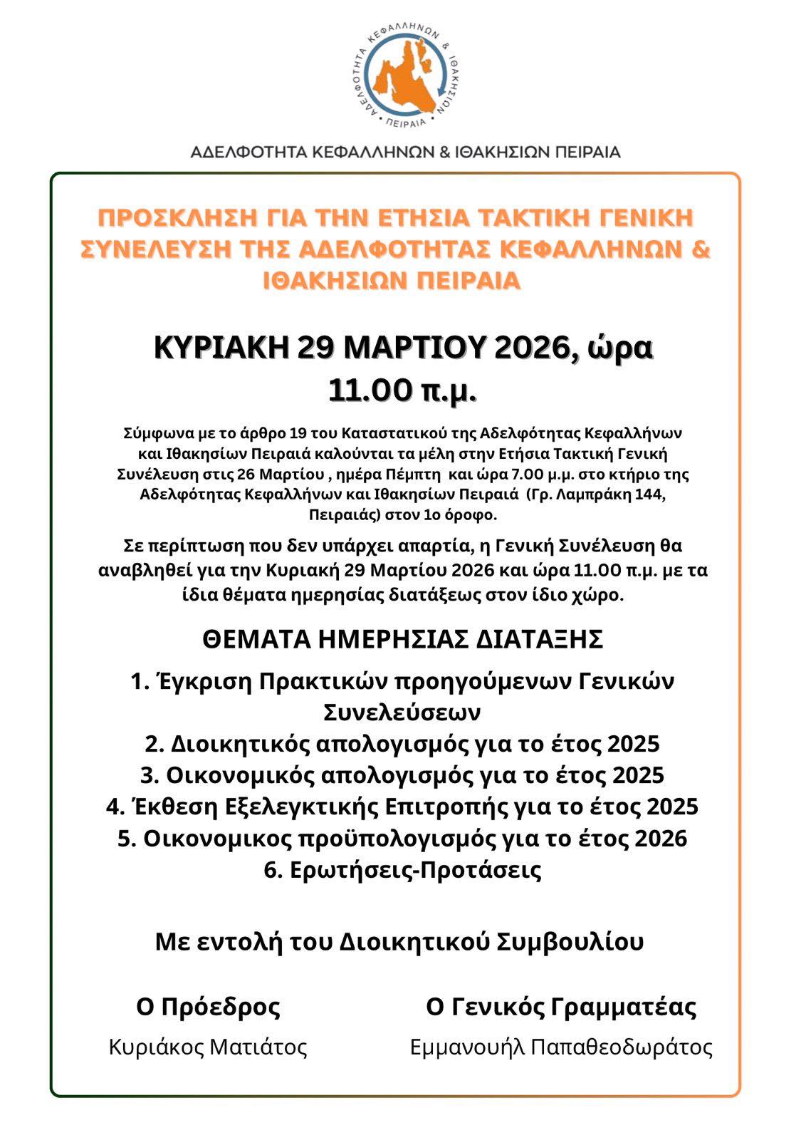 Αδελφότητα Πειραιά: Πρόσκληση στην Ετήσια Γενική Συνέλευση του συλλόγου