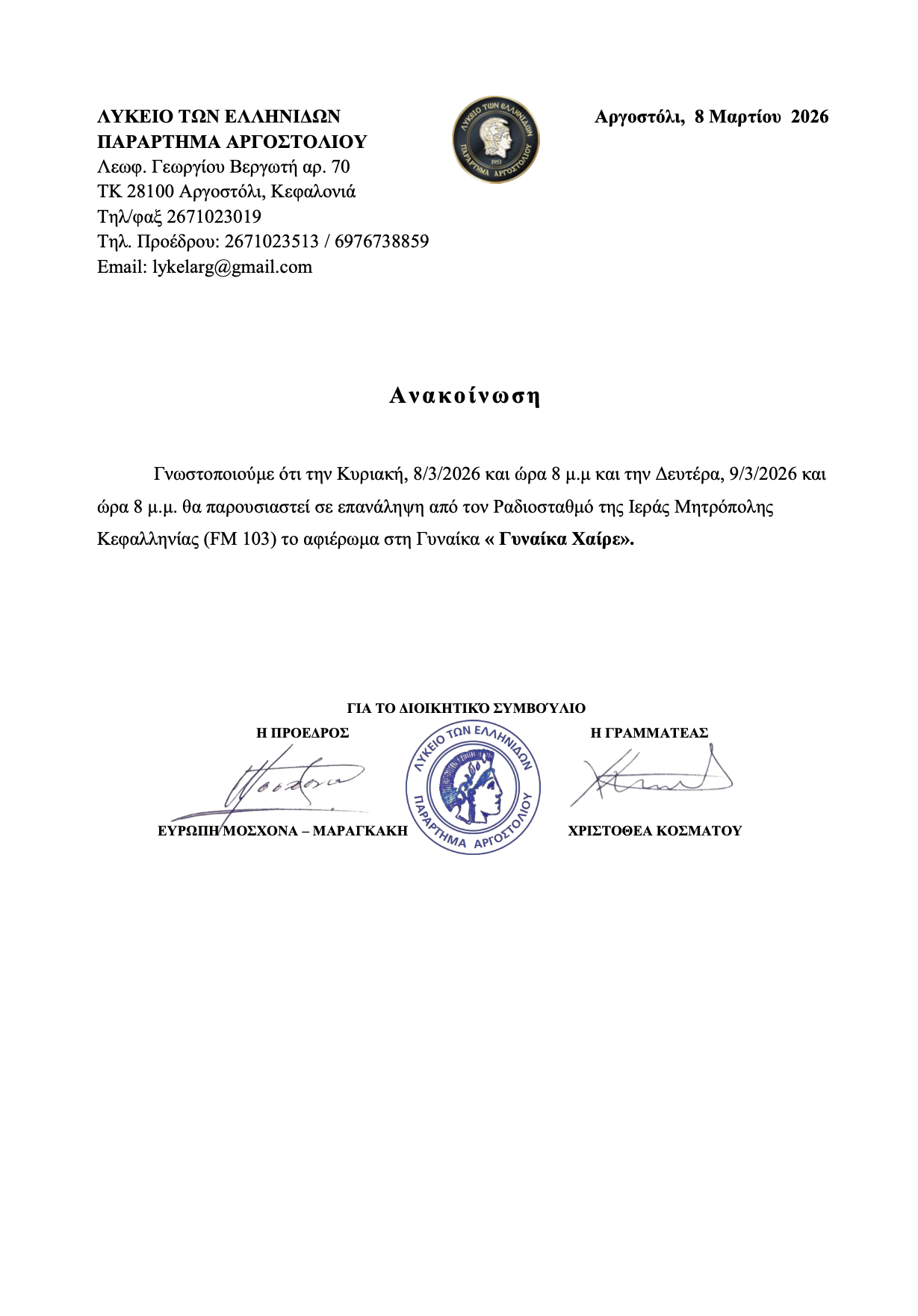 Αφιέρωμα στη Γυναίκα από το Λύκειο Ελληνίδων Αργοστολίου στον Ραδιοσταθμό της Μητρόπολης