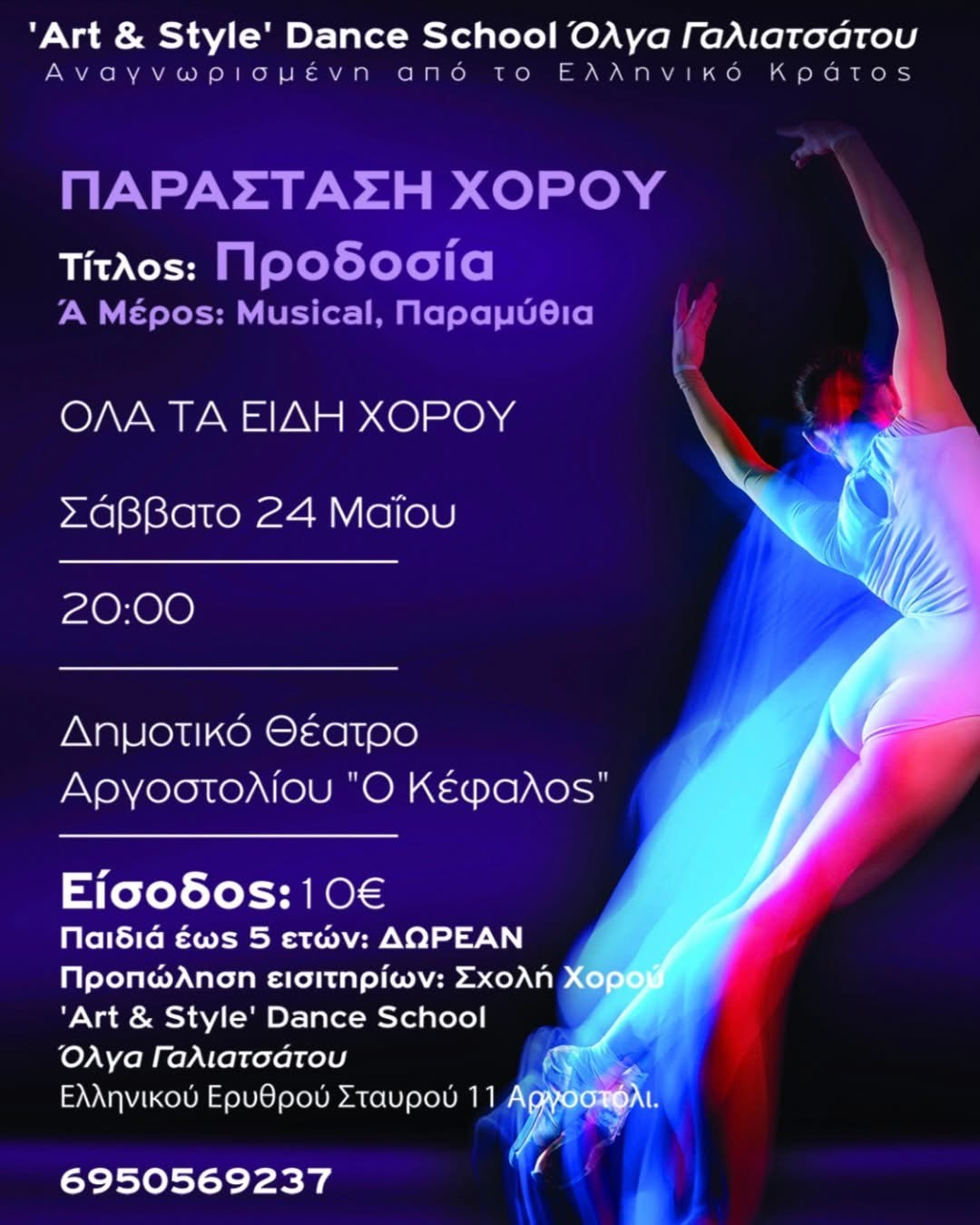 Αυτό το Σάββατο 24 Μαΐου η ετήσια παράσταση χορού της αναγνωρισμένης και βραβευμένης σχολής χορού “Art & Style” Dance School της Όλγας Γαλιατσάτου στο Δημοτικό Θέατρο Αργοστολίου ‘Ο Κέφαλος’.