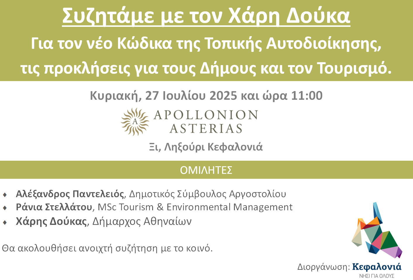 Σας προσκαλούμε την Κυριακή 27 Ιουλίου 2025 και ώρα 11:00 π.μ., στην Αίθουσα Εκδηλώσεων του ξενοδοχείου APOLLONION ASTERIAS, στο Ξι, στο Ληξούρι, σε ανοιχτή συζήτηση με τον Δήμαρχο Αθηναίων Χάρη Δούκα και θέμα τον νέο Κώδικα της Τοπικής Αυτοδιοίκησης, τις προκλήσεις για τους Δήμους και τον Τουρισμό.