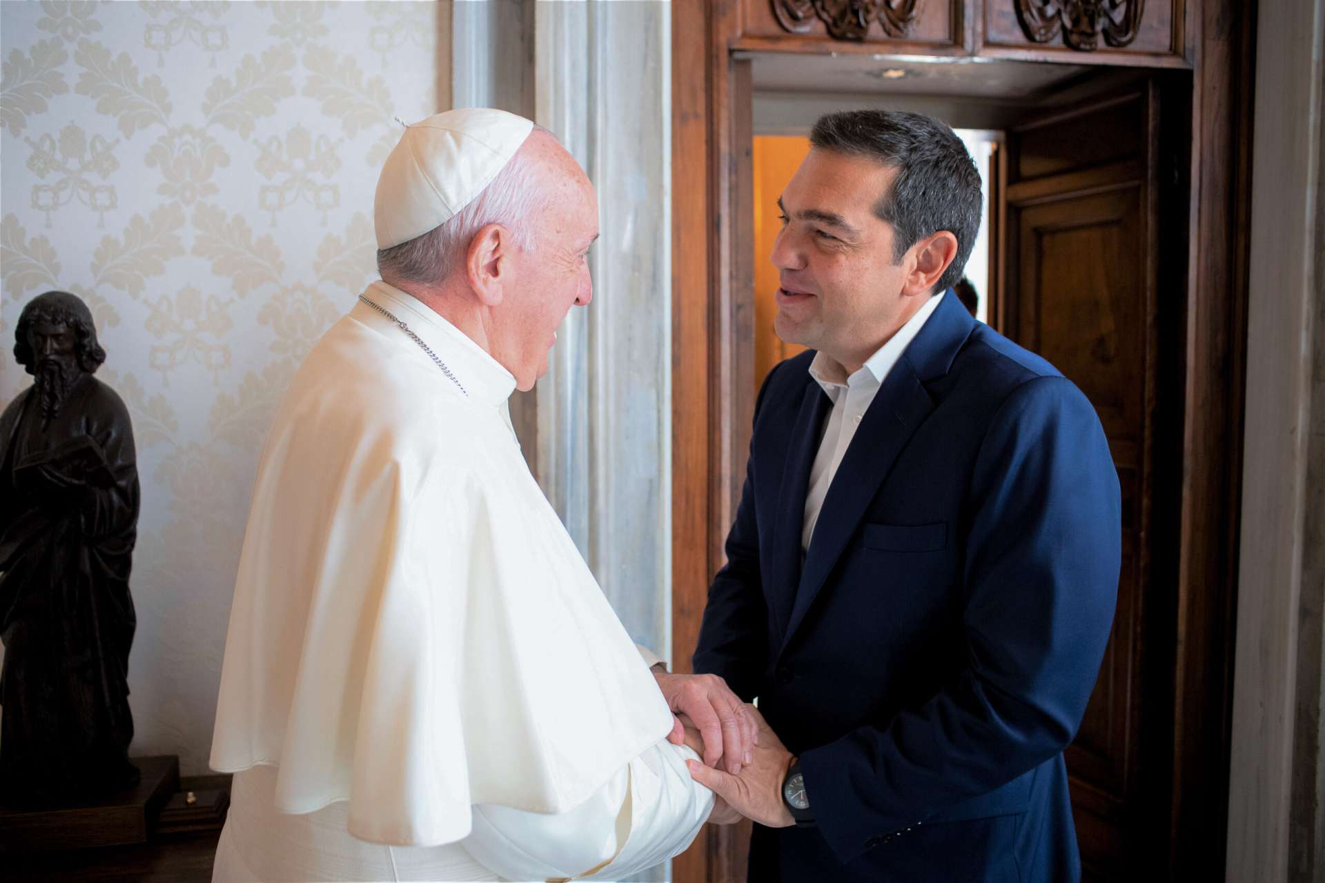 «Είχα την τύχη και την τιμή να συναντήσω αρκετές φορές τον Πάπα Φραγκίσκο πάνω από 5 κατ’ ιδίαν συναντήσεις και μπορώ να πω ότι αναπτύξαμε όχι μονάχα μία θεσμική σχέση, αλλά και μία πνευματική και ανθρώπινη σχέση. Η πρώτη φορά που τον συνάντησα ήταν τον Σεπτέμβρη του 2014, όντας αρχηγός της αντιπολίτευσης, λίγο μετά τη νίκη του ΣΥΡΙΖΑ στις Ευρωεκλογές, όταν όλη η Ευρώπη έβλεπε ότι ο ΣΥΡΙΖΑ ανέρχεται στην εξουσία μιας χρεοκοπημένης χώρας, όπως τότε ήταν η Ελλάδα, μετά από πέντε έτη συνεχή ατελέσφορων πολιτικών λιτότητας μέσα από το 1ο και 2ο μνημόνιο.