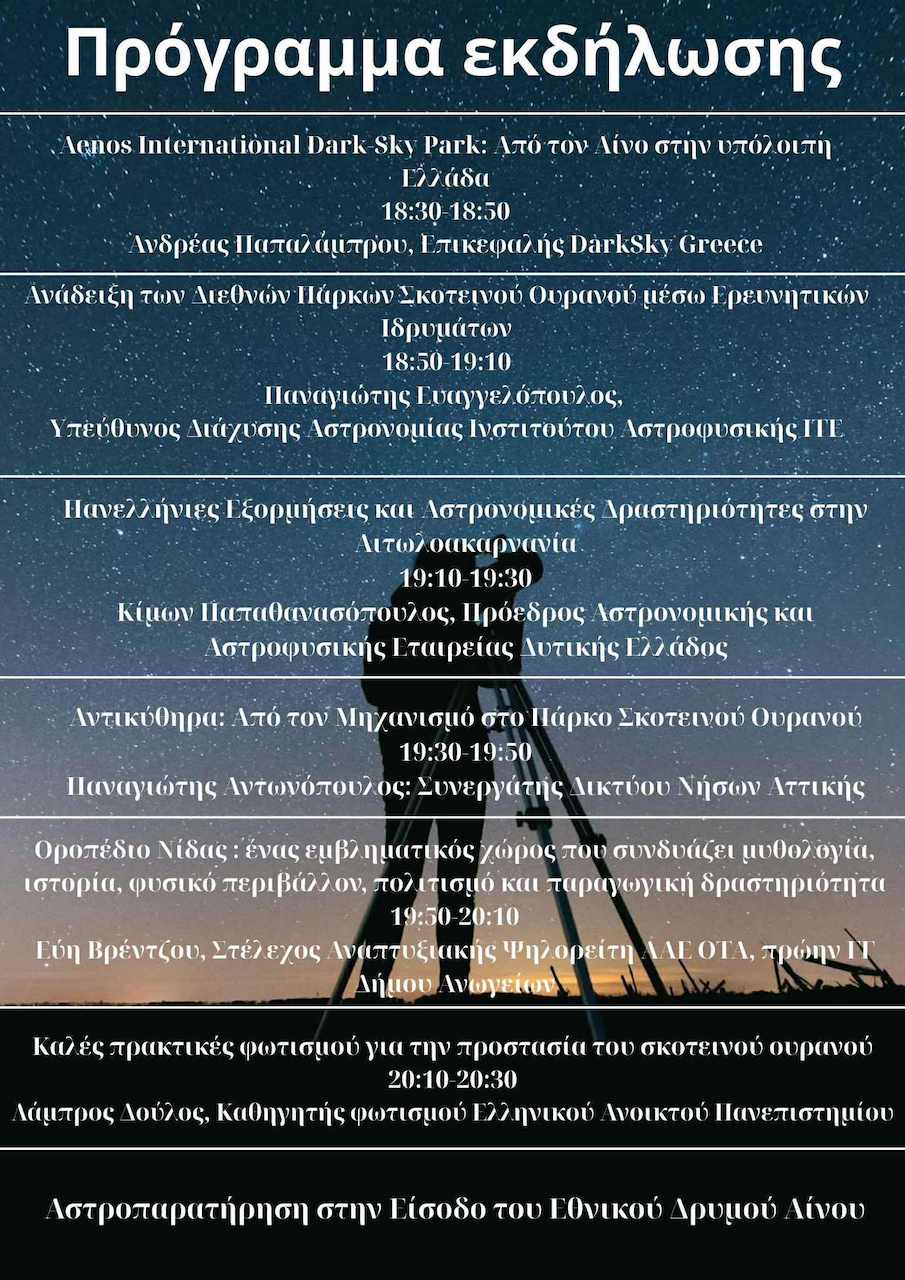 Το πρόγραμμα θα περιλαμβάνει επίσης αστροβραδιά στον Αίνο στις 22.00 και συνάντηση εκπροσώπων από περιοχές που ενδιαφέρονται να αναγνωριστούν ως International DarkSky Places.