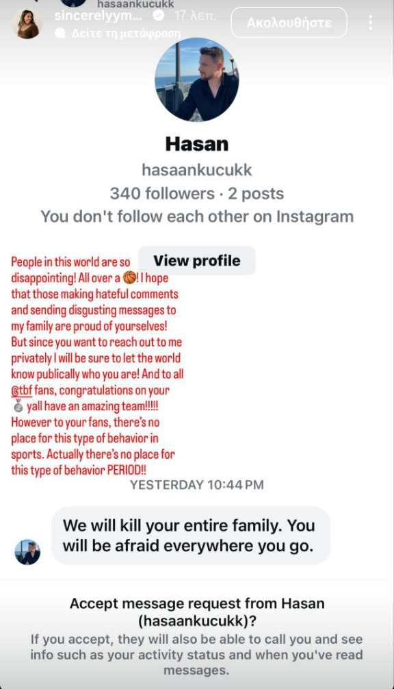«Οι άνθρωποι σε αυτόν τον κόσμο είναι τόσο απογοητευτικοί! Όλο αυτό για το μπάσκετ. Ελπίζω όσοι κάνουν σχόλια μίσους και στέλνουν αηδιαστικά μηνύματα στην οικογένειά μου να είναι περήφανοι για τον εαυτό τους! Αλλά επειδή θέλετε να επικοινωνήσετε μαζί μου ιδιωτικά, θα φροντίσω να ενημερώσω τον κόσμο δημόσια για το ποιοι είστε! Και σε όλους τους οπαδούς της Τουρκίας, συγχαρητήρια για το ασημένιο μετάλλιο σας, έχετε μια καταπληκτική ομάδα!!!! Ωστόσο, δεν υπάρχει χώρος για τέτοιου είδους συμπεριφορά στον αθλητισμό. Στην πραγματικότητα, δεν υπάρχει χώρος για τέτοιου είδους συμπεριφορά ΤΕΛΟΣ!!»