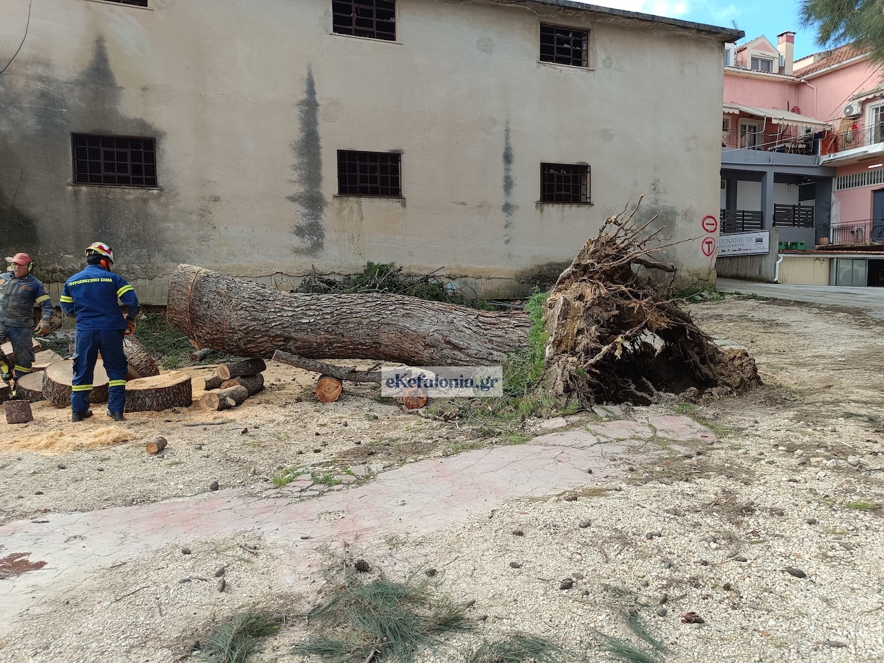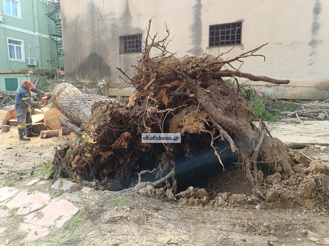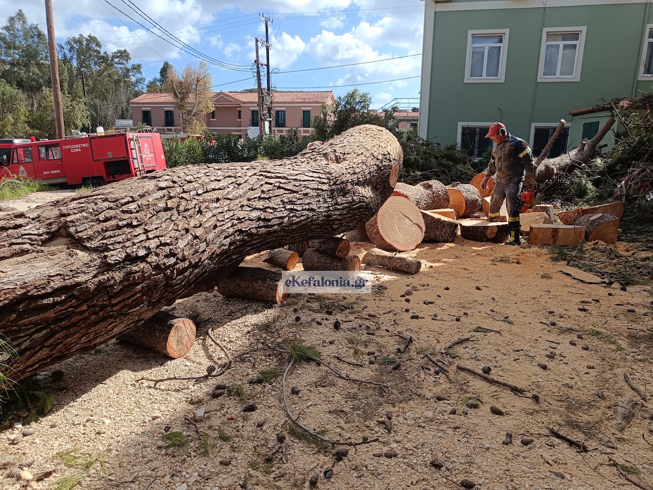 Ένα ιδιαίτερα επικίνδυνο περιστατικό σημειώθηκε στο Αργοστόλι, όταν πεύκο που βρισκόταν κοντά στο κτίριο της Πυροσβεστικής Υπηρεσίας ξεριζώθηκε εξαιτίας των ισχυρών ανέμων που έπνεαν στην περιοχή.