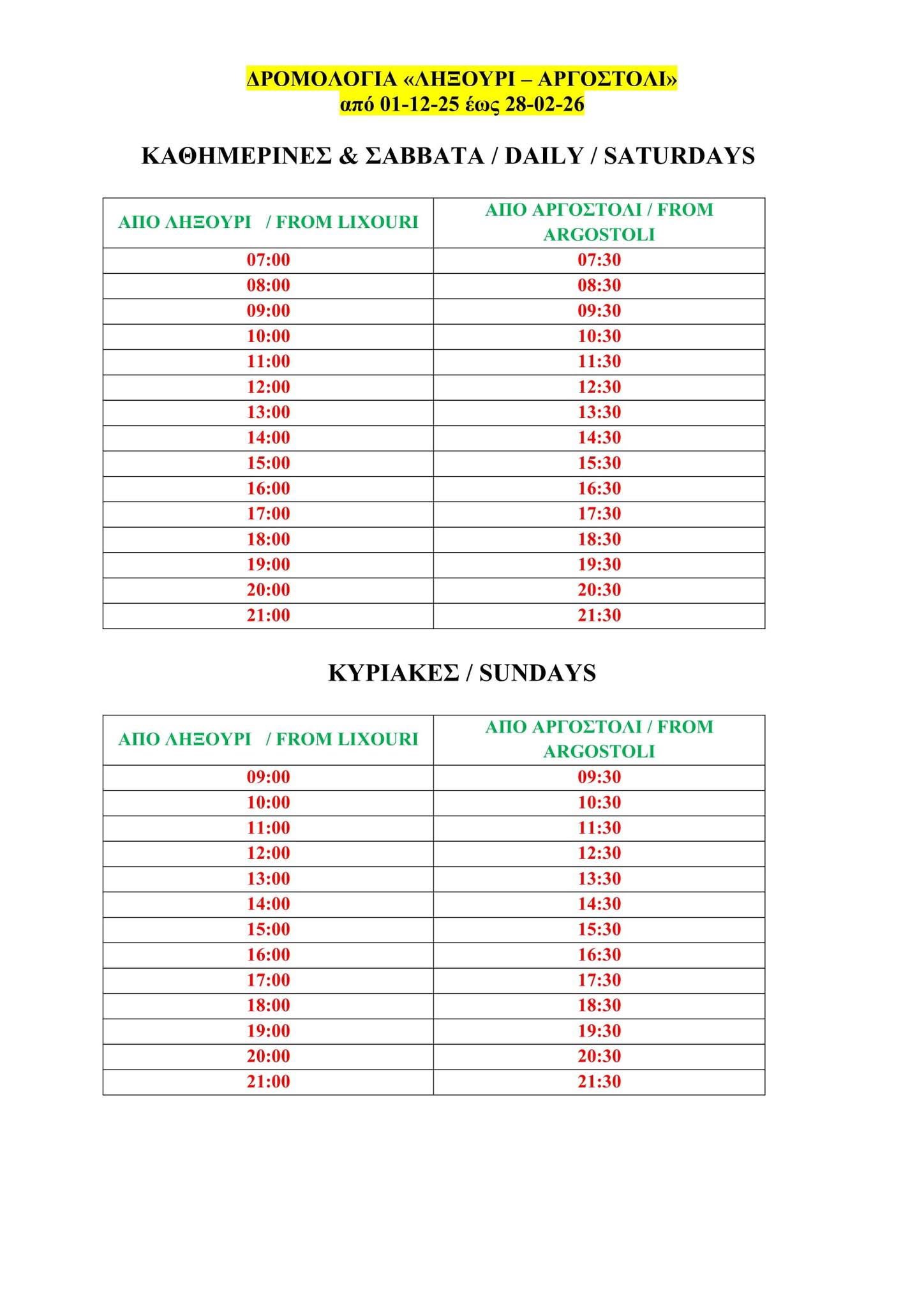 Καλημέρα, σας παρουσιάζουμε τους πίνακες δρομολογίων μας στην γραμμή <<Ληξούρι - Αργοστόλι>>, από Δευτέρα 01-12-2025 έως Σάββατο 28-02-2026.