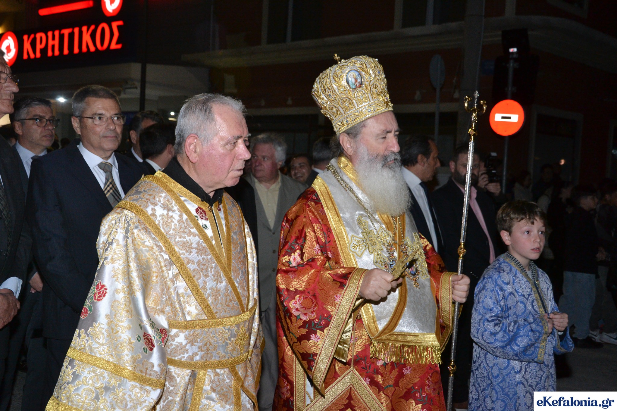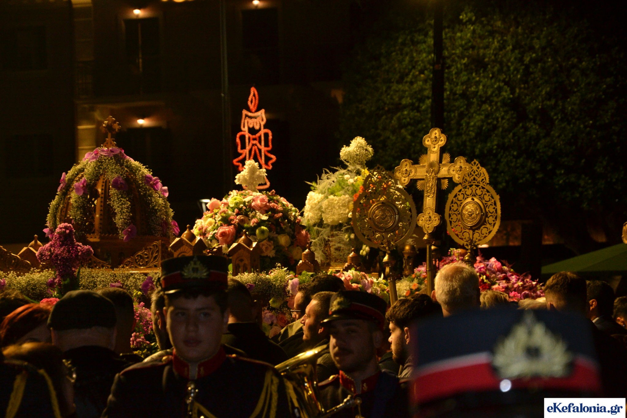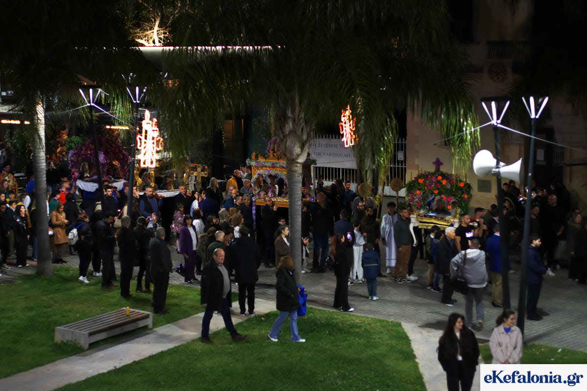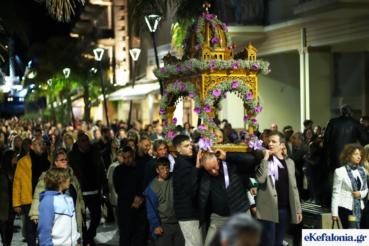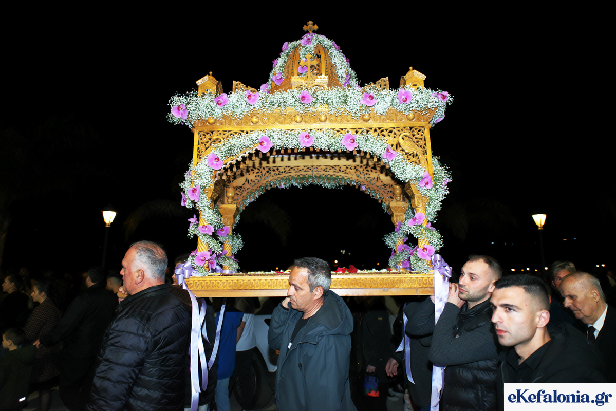 Ακολούθησε η καθιερωμένη περιφορά του Επιταφίου στους κεντρικούς δρόμους της πόλεως και η συνάντηση με τους Επιταφίους της ενορίας του Αγίου Νικολάου, της Σισσίωτισσας, του Αγ. Σπυρίδωνος καθώς και των Ταξίαρχων καταλήγοντας στην κεντρική πλατεία της πόλης του Αργοστολίου.
