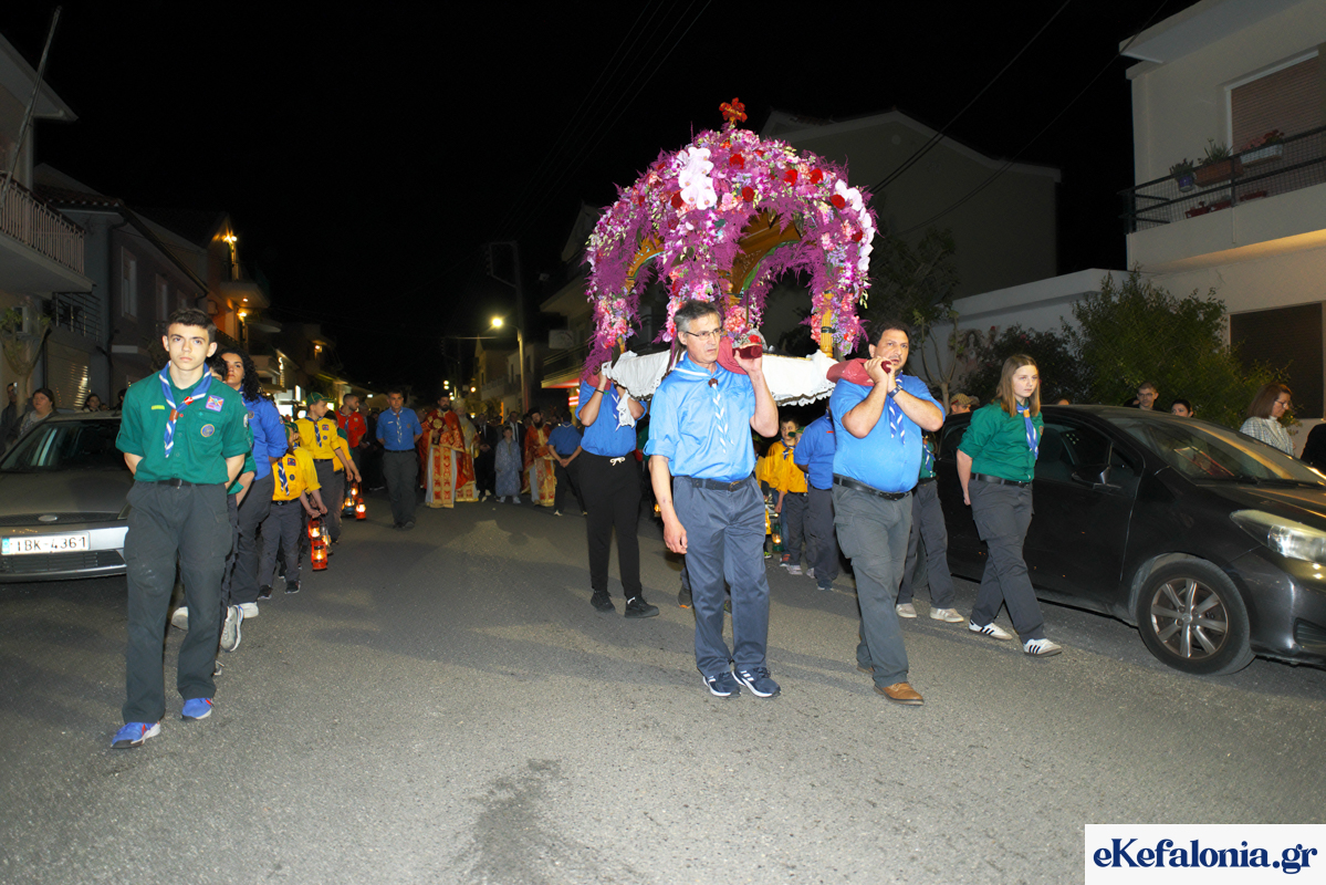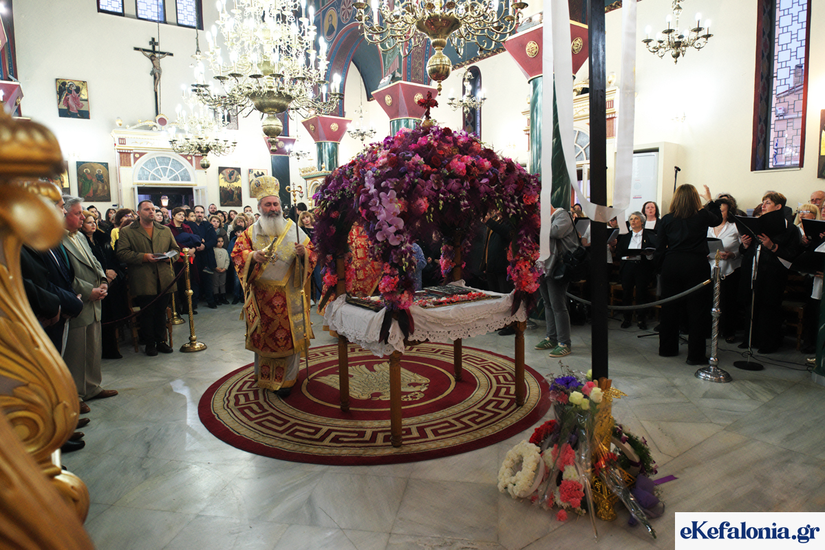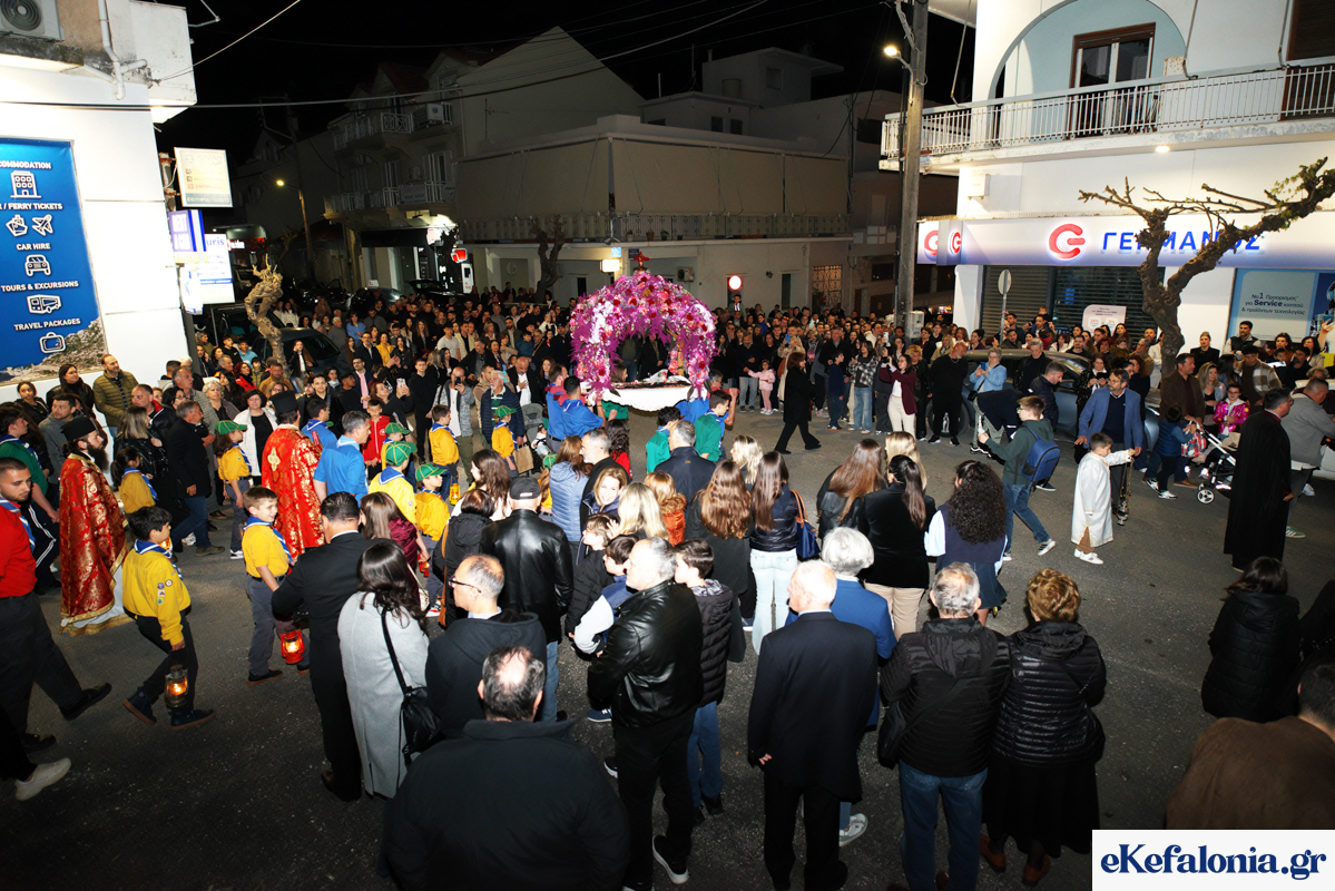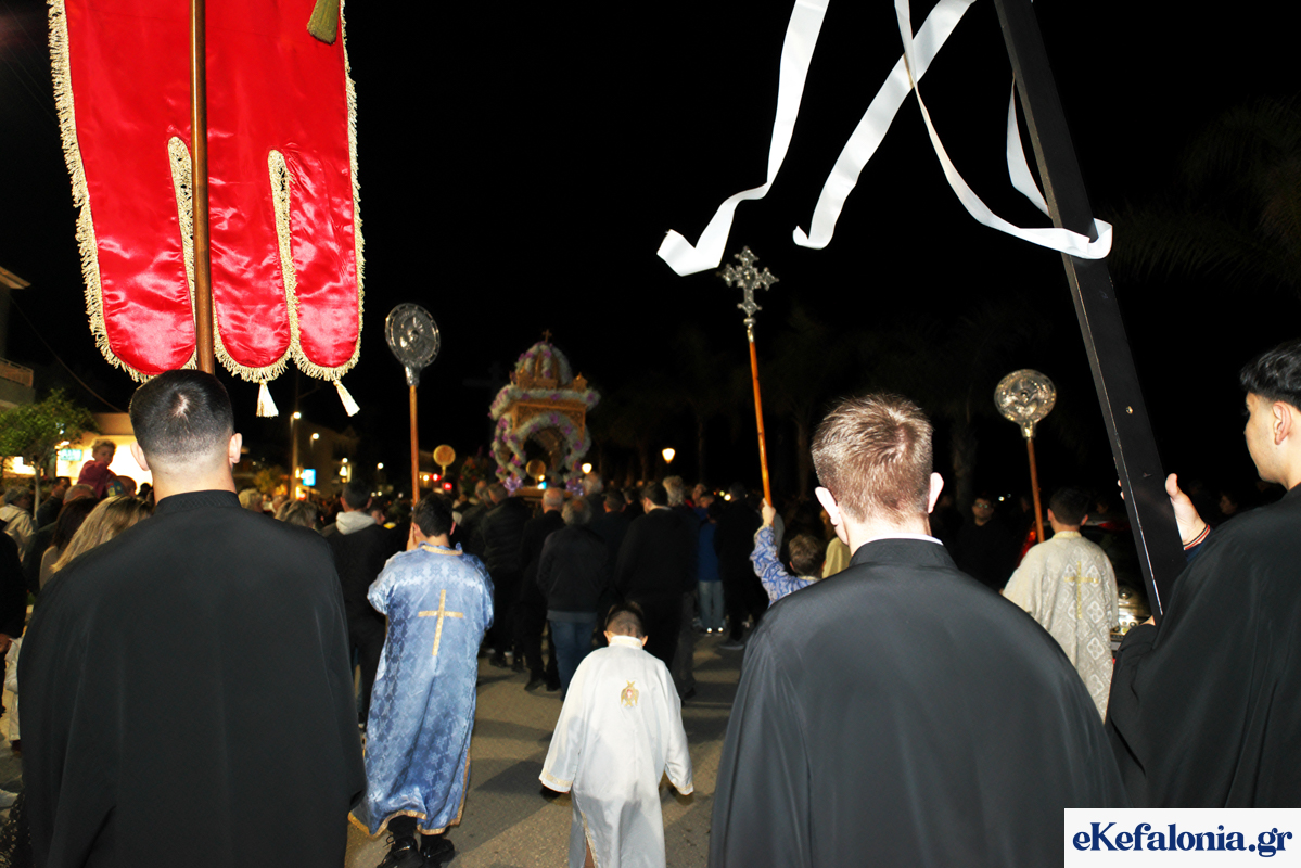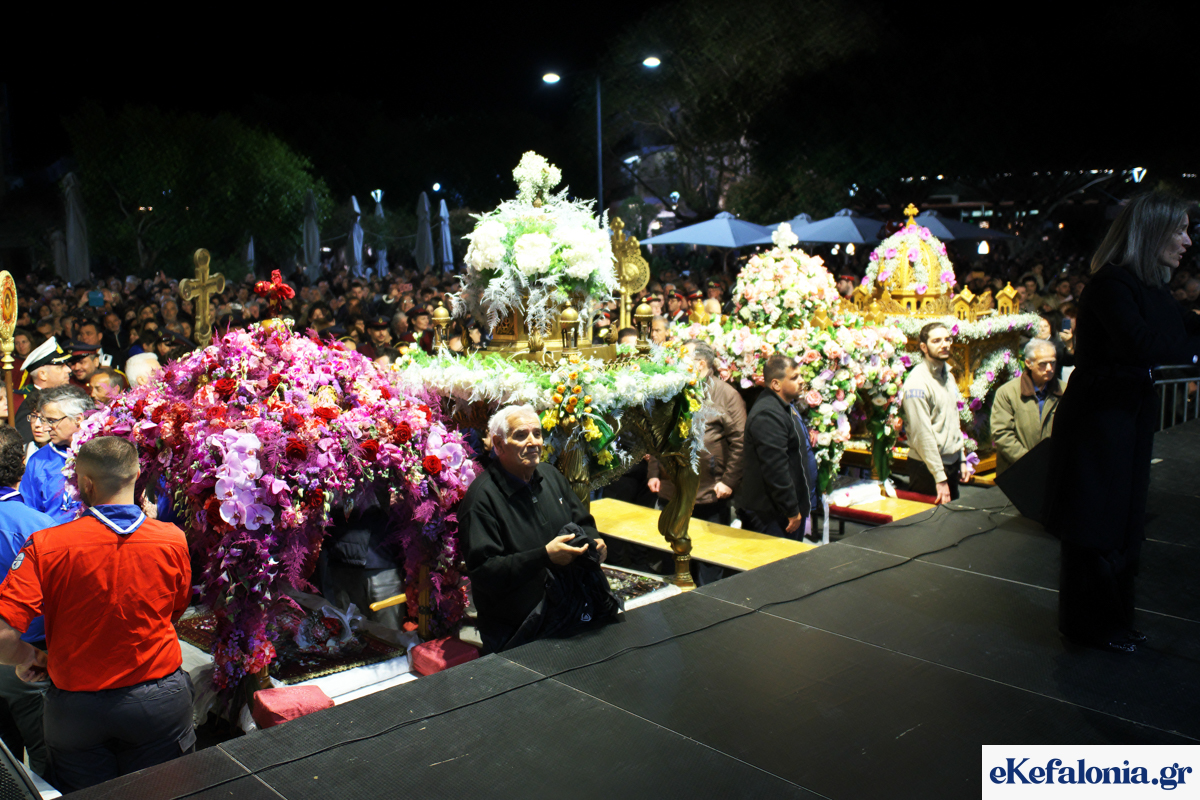 Ακολούθησε η καθιερωμένη περιφορά του Επιταφίου στους κεντρικούς δρόμους της πόλεως και η συνάντηση με τους Επιταφίους της ενορίας του Αγίου Νικολάου, της Σισσίωτισσας, του Αγ. Σπυρίδωνος καθώς και των Ταξίαρχων καταλήγοντας στην κεντρική πλατεία της πόλης του Αργοστολίου.