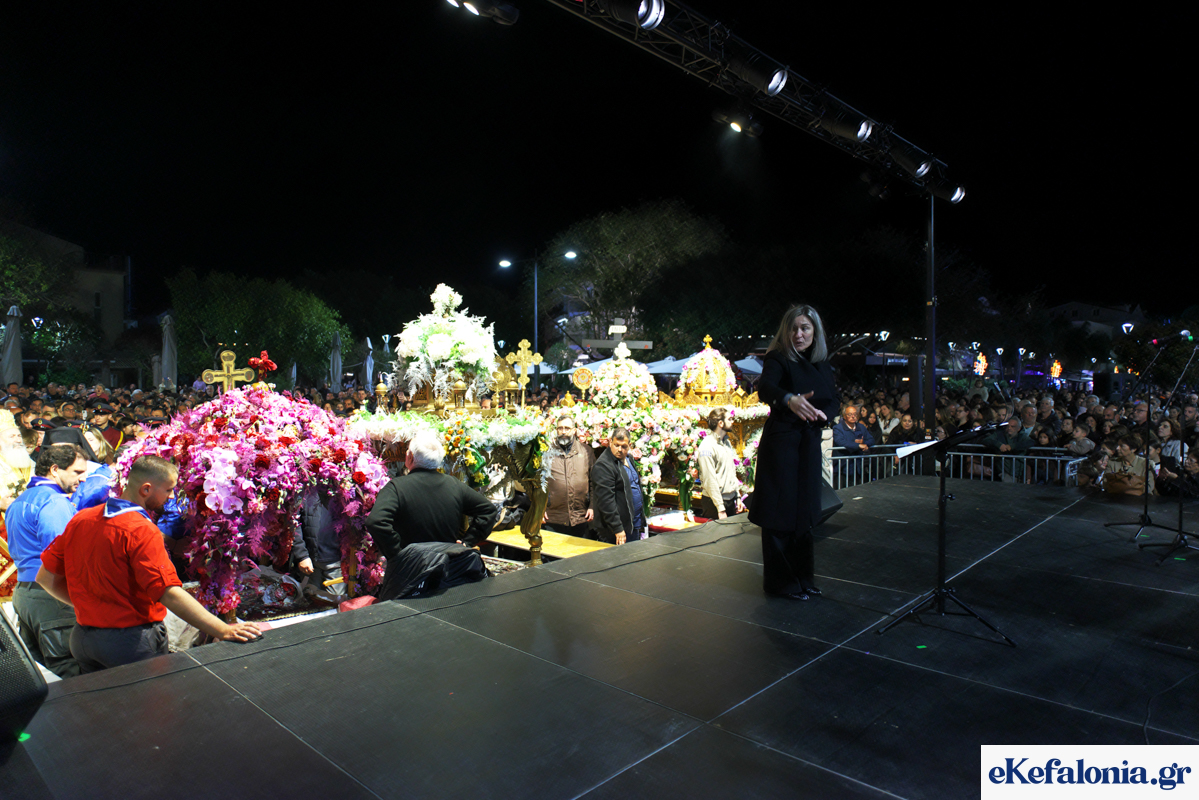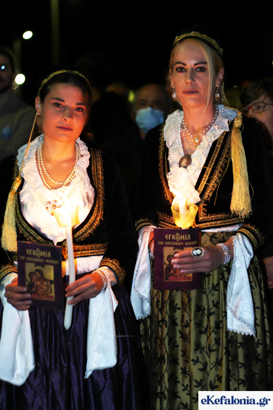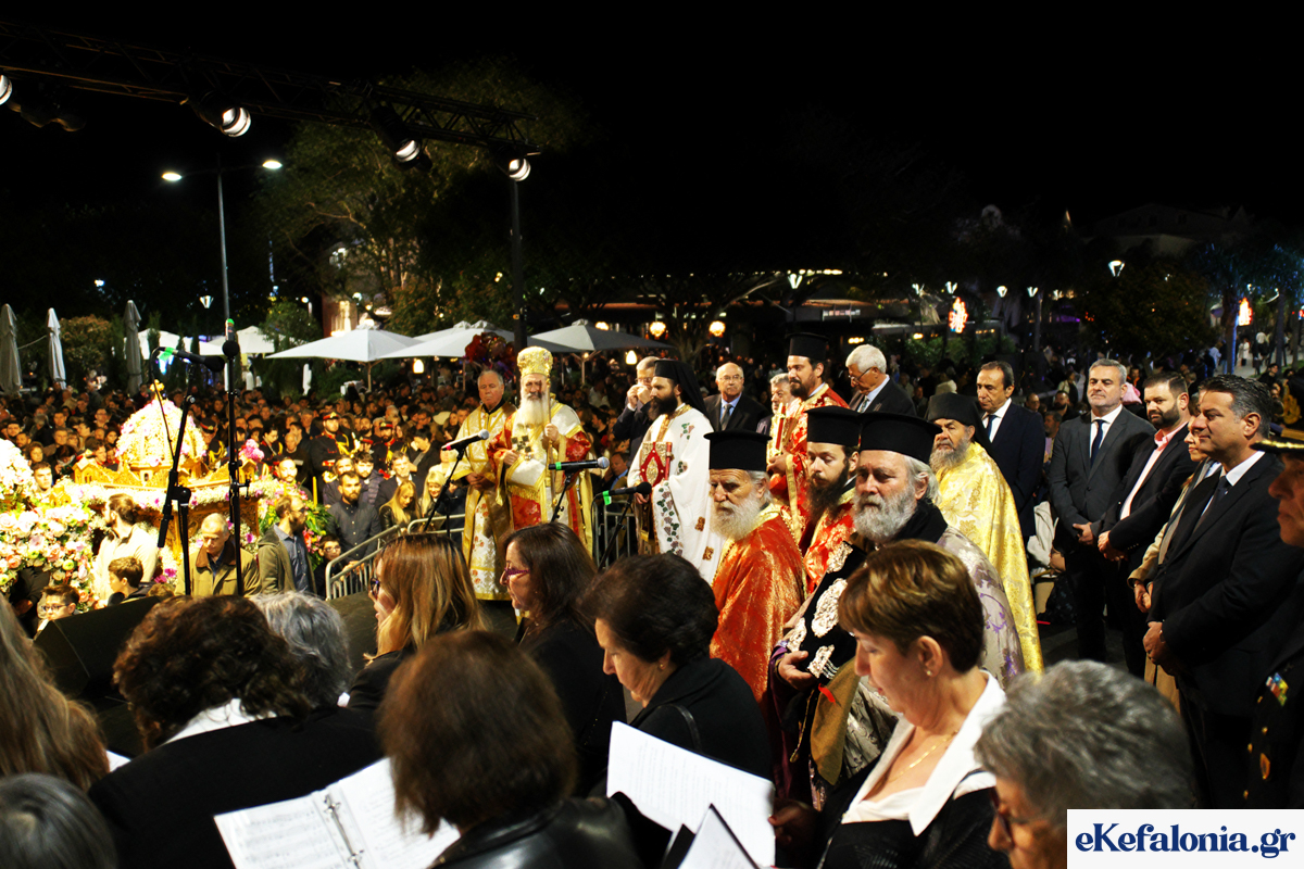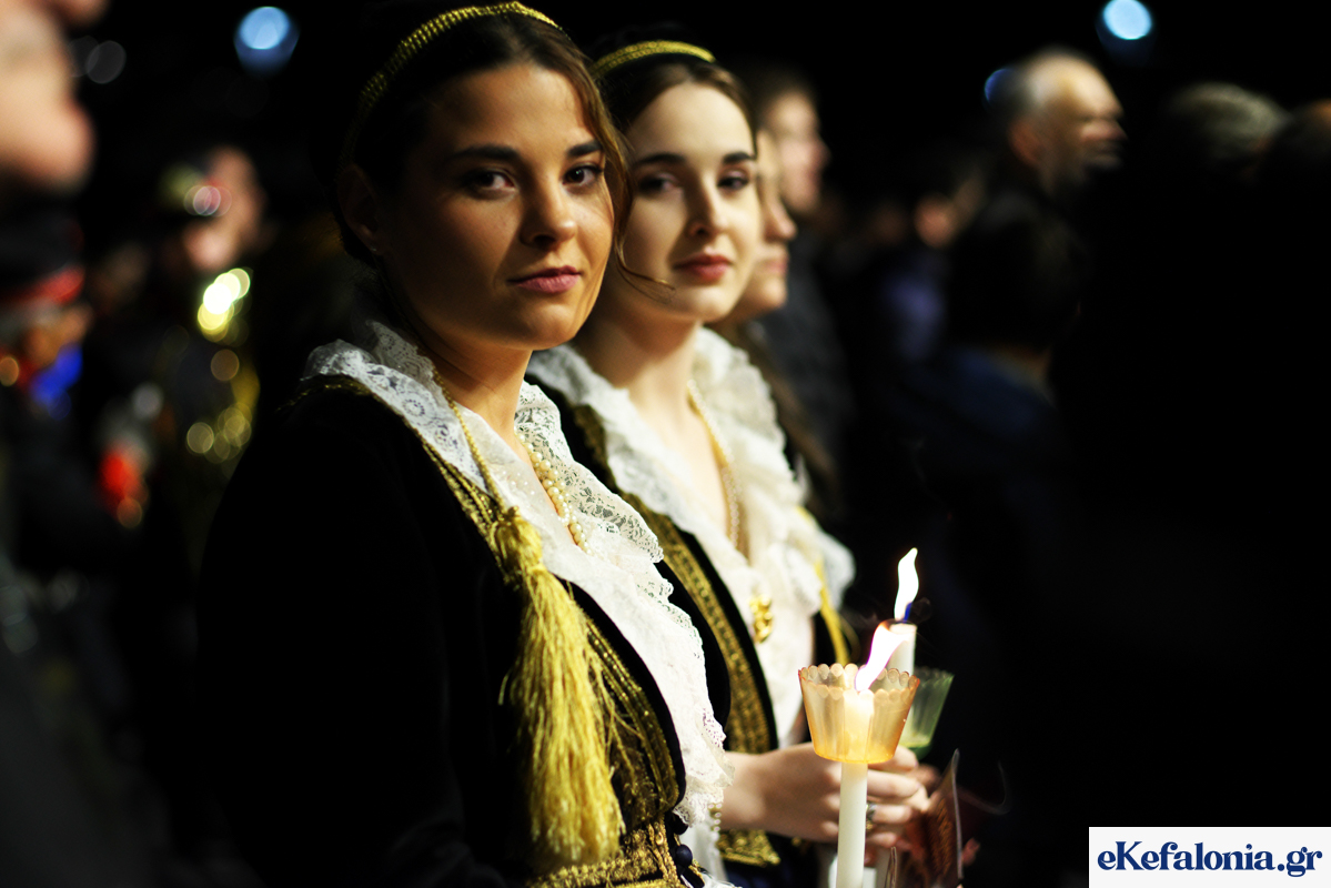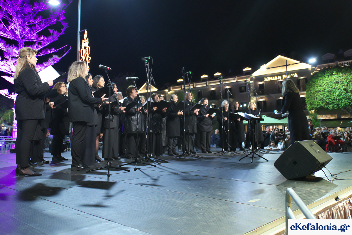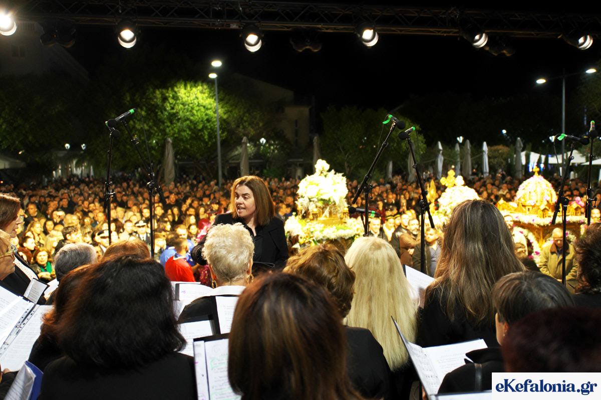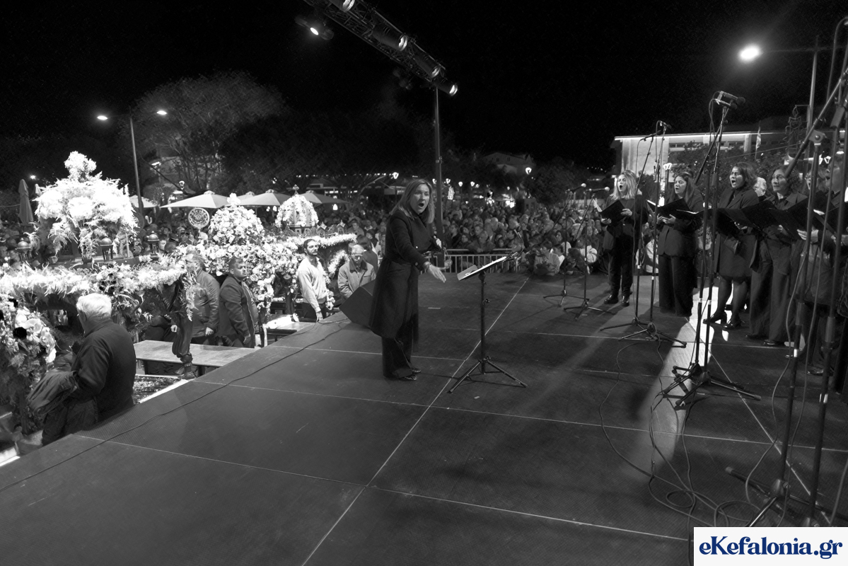 Φέτος, ιδιαίτερο τόνο έδωσε το γυναικείο τμήμα της Χορωδίας Αργοστολίου υπό τη διεύθυνση της Αλεξίας Μαρτσέλου αλλά και τη Γυναικεία Χορωδία του Δήμου Αργοστολίου υπό τη διεύθυνση της Σταυρούλας Πολλάτου έψαλαν τα εγκώμια, στην πλατεία Βαλλιάνου.