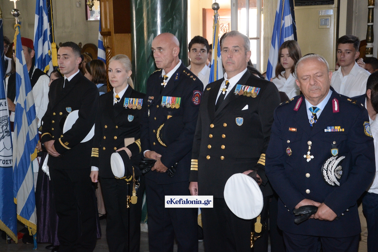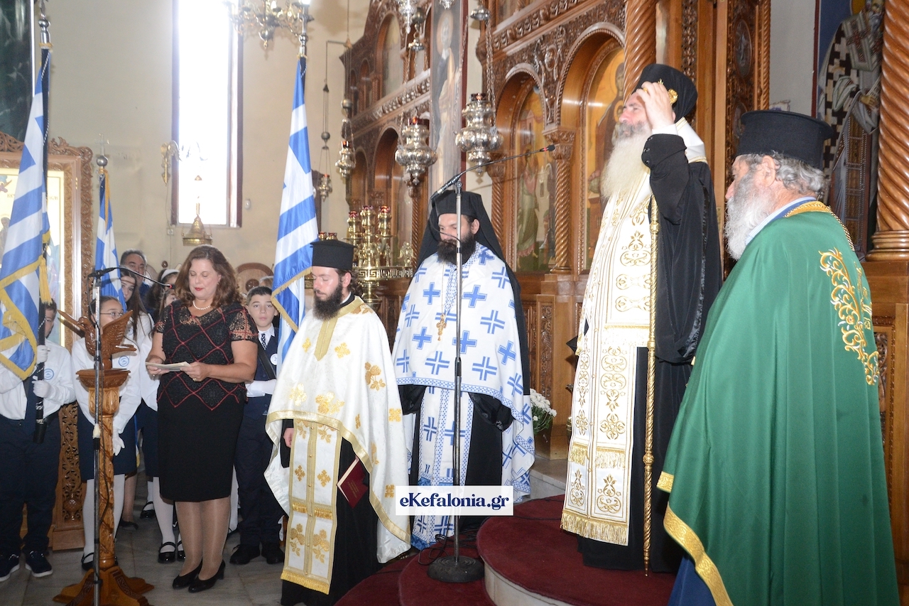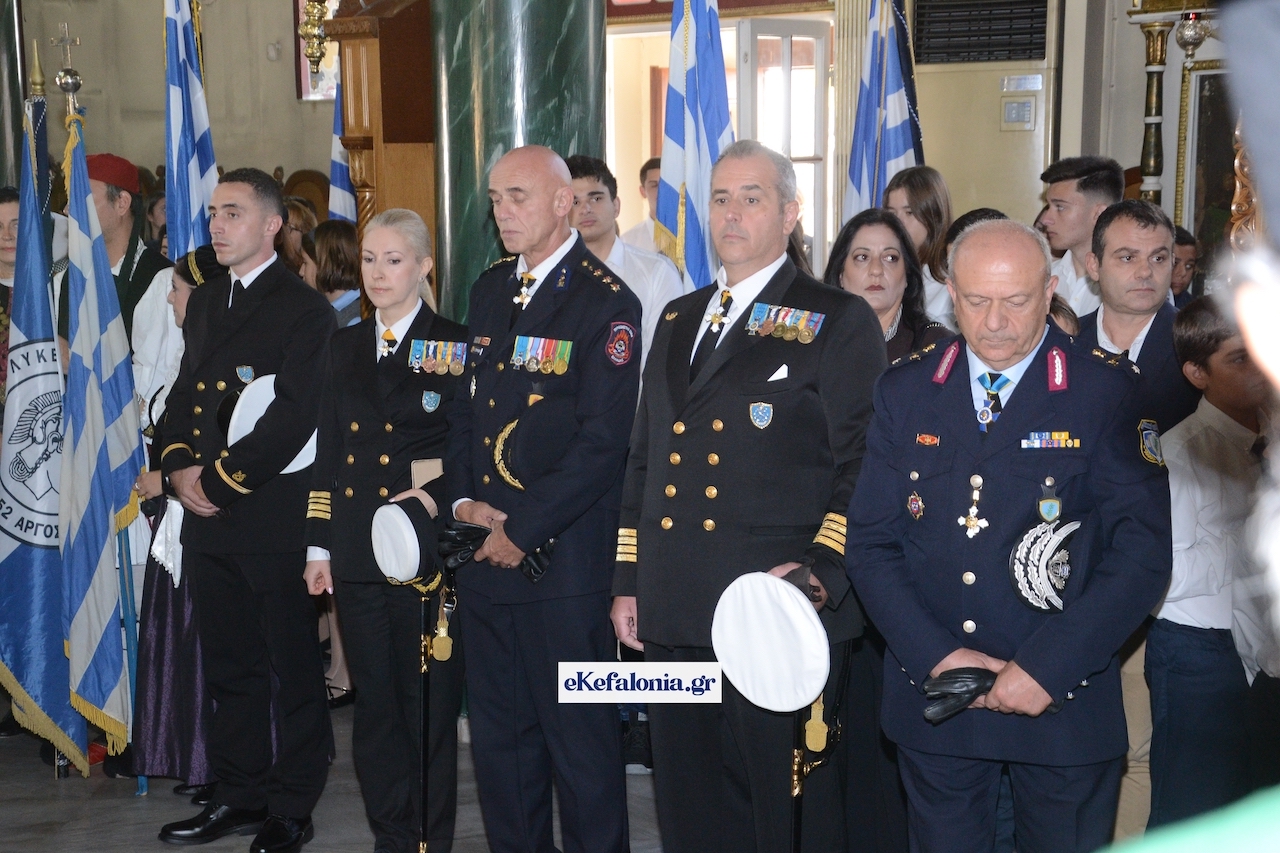 Από νωρίς το πρωί η Μητρόπολη γέμισε με τις γαλανόλευκες καθώς μαθητές των σχολείων της πόλης και εκπρόσωποι φορέων και συλλόγων προσήλθαν για την τέλεση της Δοξολογίας. Νωρίτερα, απ΄όλες τις ενορίες της πόλεως του Αργοστολίου οι καμπάνες χτυπούσαν χαρμόσυνα!
