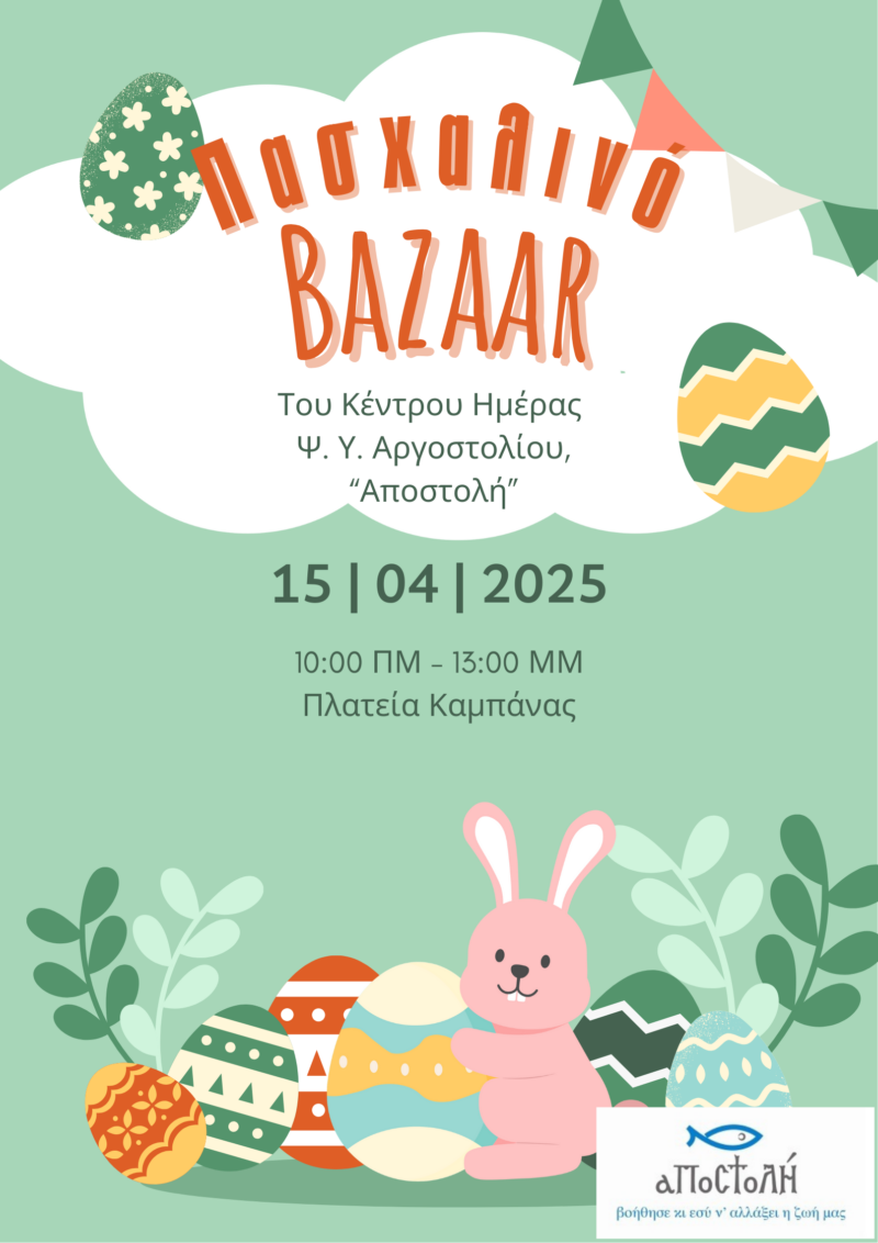 Ελάτε στο Πασχαλινό Παζάρι που διοργανώνουν οι ωφελούμενοι του Κέντρου Ημέρας Ψυχικής Υγείας Αργοστολίου “ΑΠΟΣΤΟΛΗ”! Μια μοναδική ευκαιρία να βρείτε όμορφες, χειροποίητες πασχαλινές λαμπάδες και να στηρίξετε τις δράσεις του κέντρου. Σας περιμένουμε με χαρά!