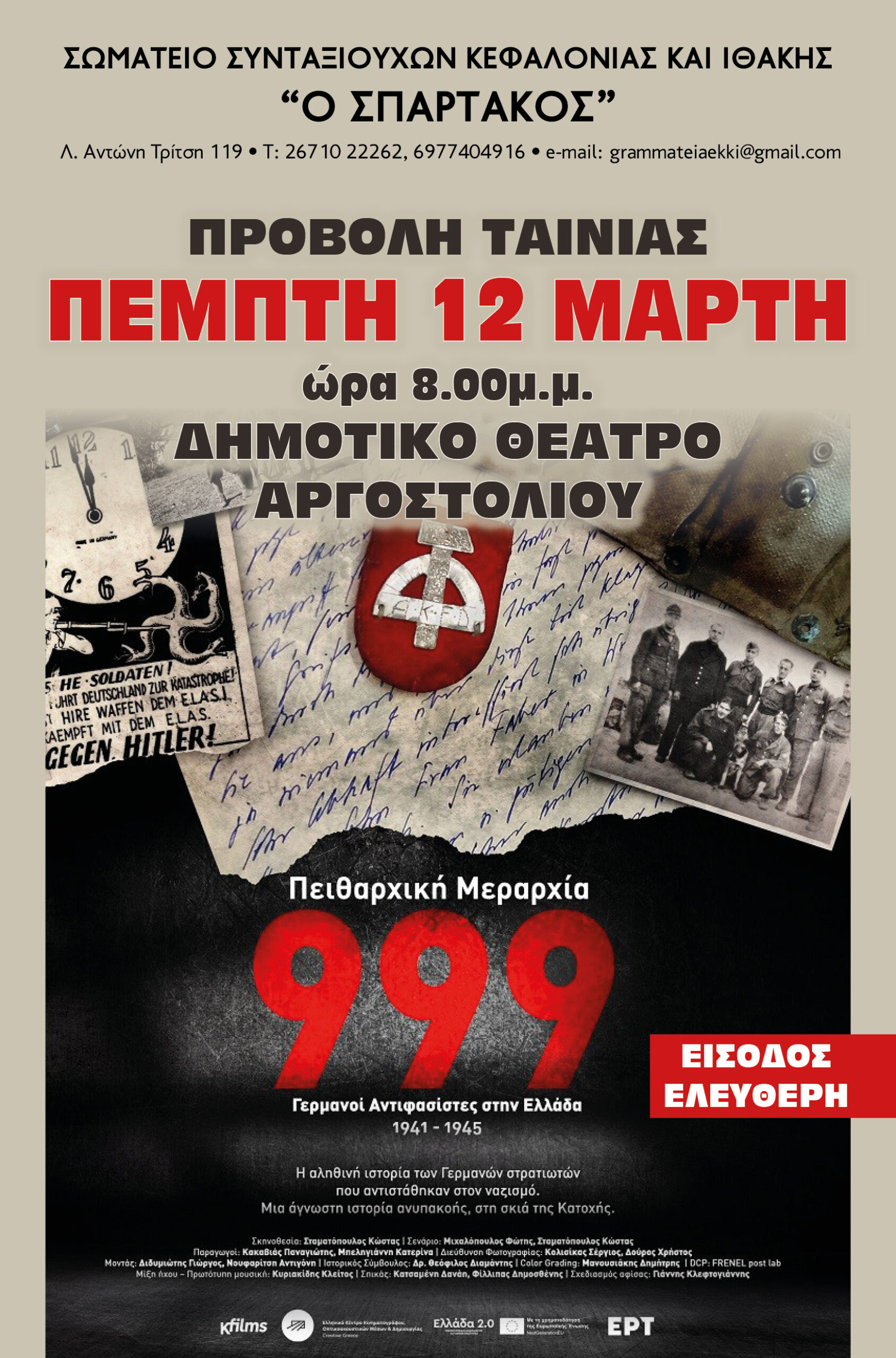 Αργοστόλι: Προβολή της ιστορικής ταινίας «Πειθαρχική Μεραρχία 999» την Πέμπτη στο Δημοτικό θέατρο