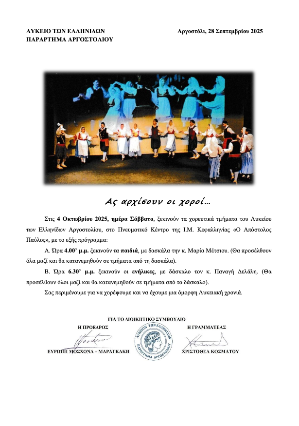 «Ας αρχίσουν οι χοροί»: Έναρξη χορευτικών τμημάτων από το Λύκειο των Ελληνίδων Αργοστολίου