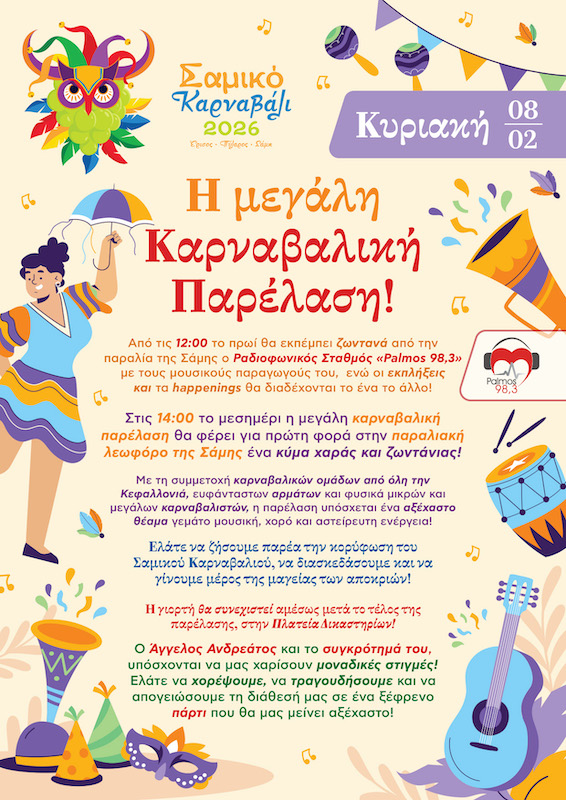 Κυριακή 8 Φεβρουαρίου λοιπόν, ελάτε να ζήσουμε παρέα την κορύφωση του Σαμικού Καρναβαλιού, σε ένα ξέφρενο πάρτι που θα μας μείνει αξέχαστο!
