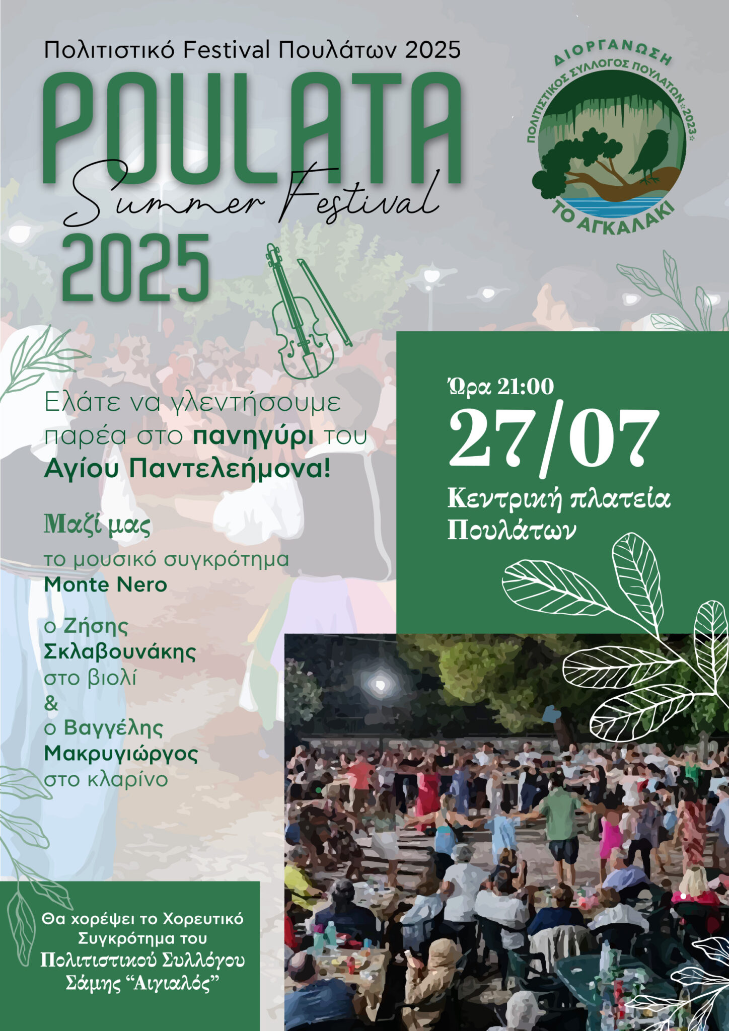 Ο Πολιτιστικός Σύλλογος Πουλάτων “Το Αγκαλάκι” σας προσκαλεί στο παραδοσιακό πανηγύρι του Αγίου Παντελεήμονα την Κυριακή 27 Ιουλίου στις 21:00 το βράδυ να διασκεδάσουμε παρέα με τους Monte Nero, τον Ζήση Σκλαβουνάκη στο βιολί και τον Βαγγέλη Μακρυγιώργο στο κλαρίνο. Μαζί μας και το χορευτικό συγκρότημα του Πολιτιστικού Συλλόγου Σάμης “Ο Αιγιαλός”.