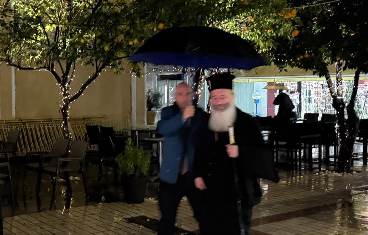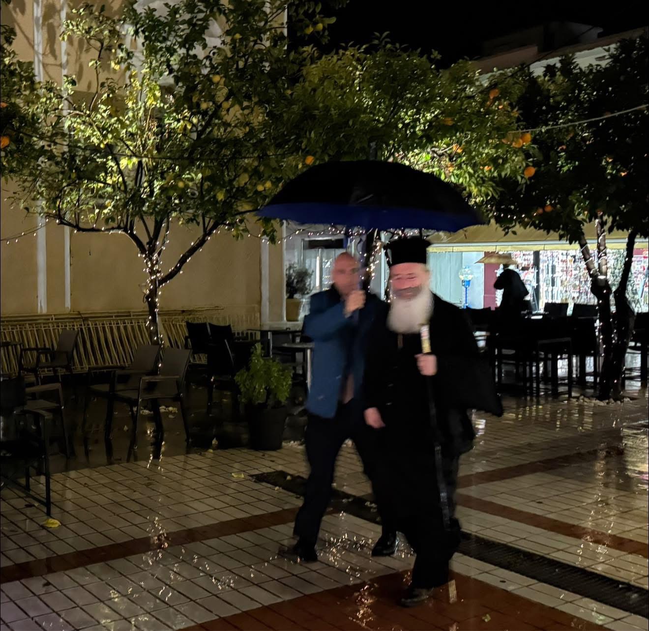 Δεν είναι σίγουρα η πρώτη φορά που ο καιρός χαλάει τα σχέδια παραμονή Χριστουγέννων σε κανταδόρους και Φιλαρμονικές. Φέτος ο Μητροπολίτης δεν άκουσε τα κάλαντα όπως επιτάσσει το έθιμο από το πεζούλι του Αγ. Σπυρίδωνα μετά από τον Εσπερινό των Χριστουγέννων. Όπως βλέπουμε και στη φωτογραφία ο Δεσπότης εισέρχεται στο ναό μέσα σε καταρρακτώδη βροχή.