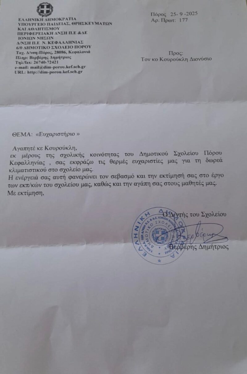 Τους πιο θερμούς επαίνους μας στην οικογένεια του Διονύση και Δημήτρη Κουρούκλη (Ξενοδοχείο Φιλοξένια στον Πόρο) που δώρισαν εν όψει του χειμώνα ένα ολοκαίνουργιο κλιματιστικό στο Δημοτικό Σχολείο του Πόρου Κεφαλονιάς!