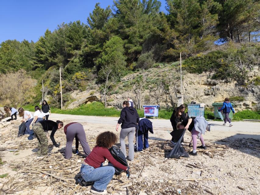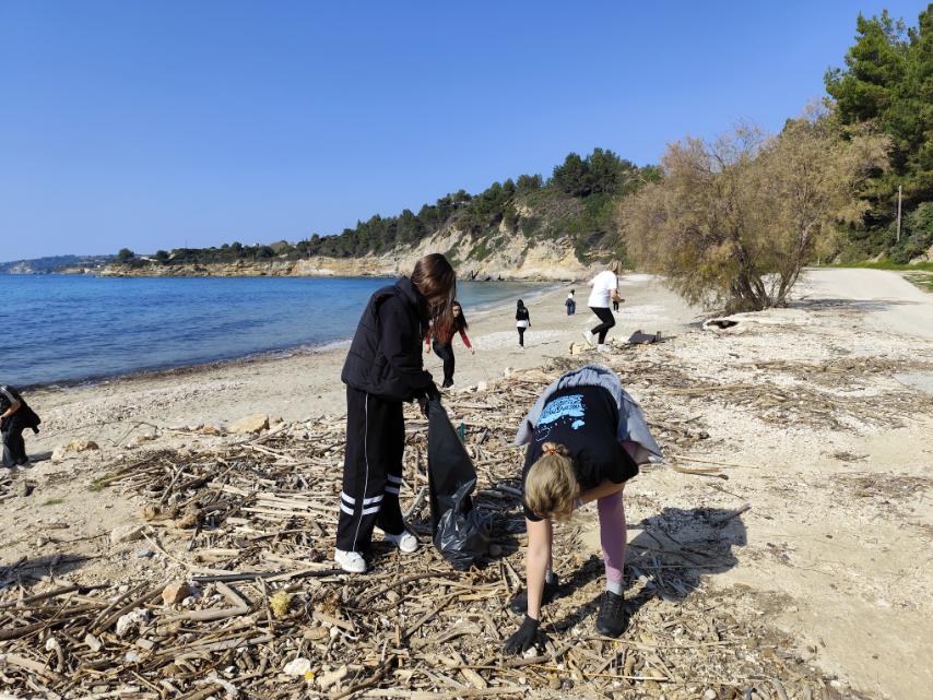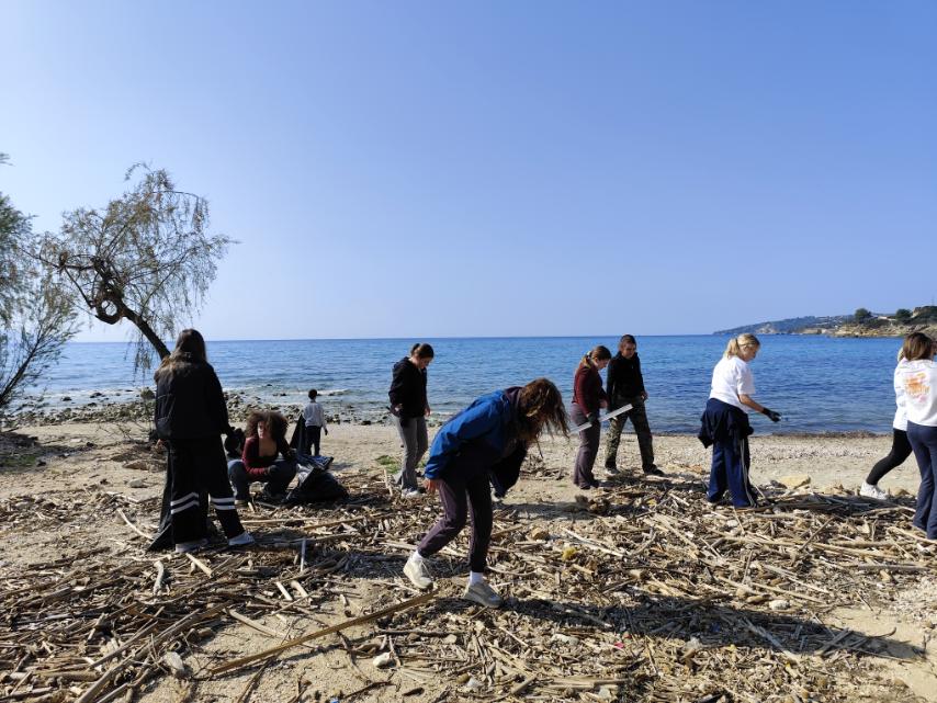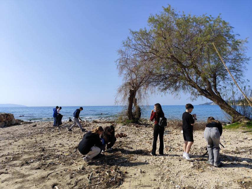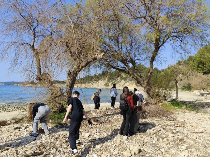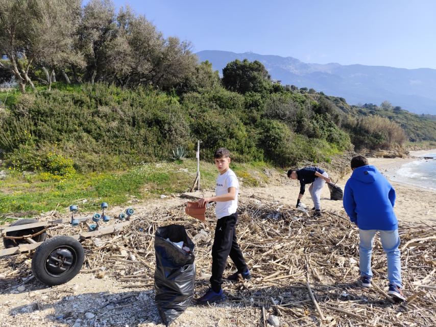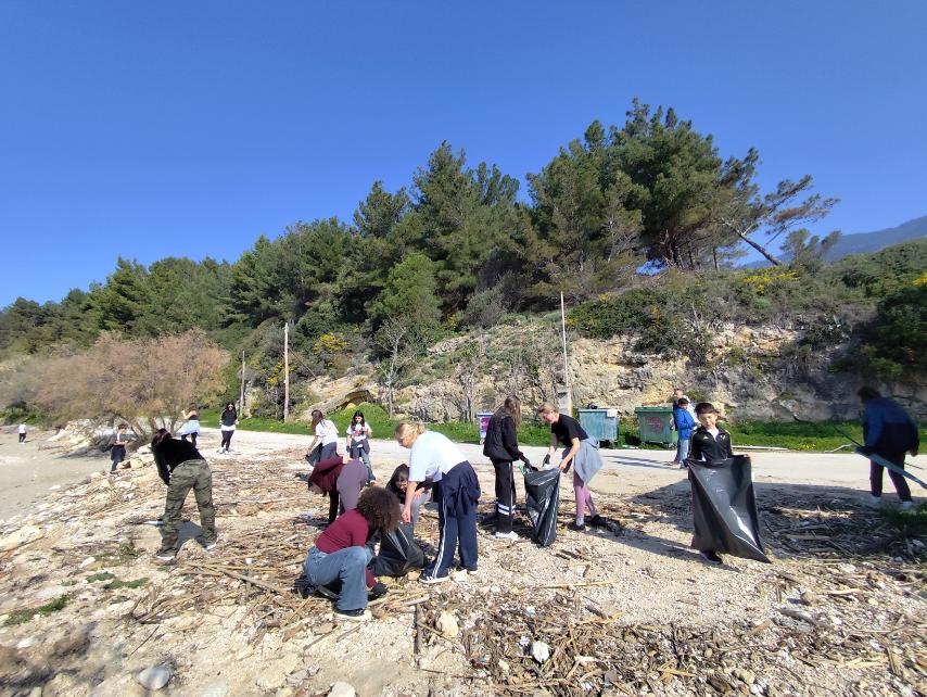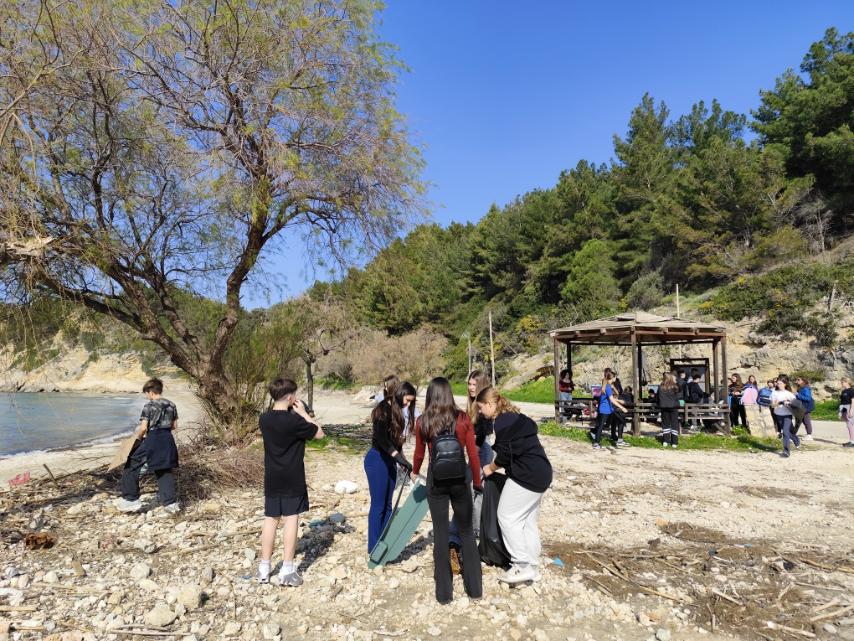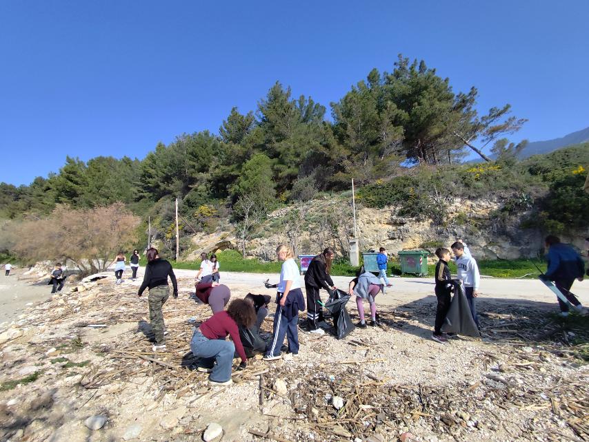 Καθαρισμό της παραλίας Τραπεζάκι, με τους μαθητές να συγκεντρώνουν απορρίμματα και να συμβάλλουν στην προστασία του φυσικού τοπίου.