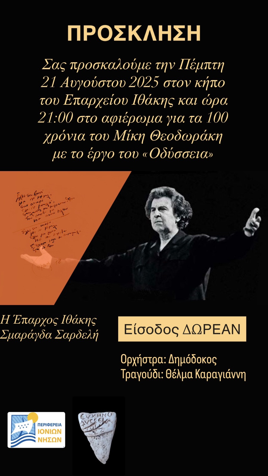 Σας προσκαλούμε την Πέμπτη 21 Αυγούστου 2025 και ώρα 21:00, στον κήπο του Επαρχείου Ιθάκης, στο αφιέρωμα για τα 100 χρόνια του Μίκη Θεοδωράκη με το έργο του ” ΟΔΥΣΣΕΙΑ”.