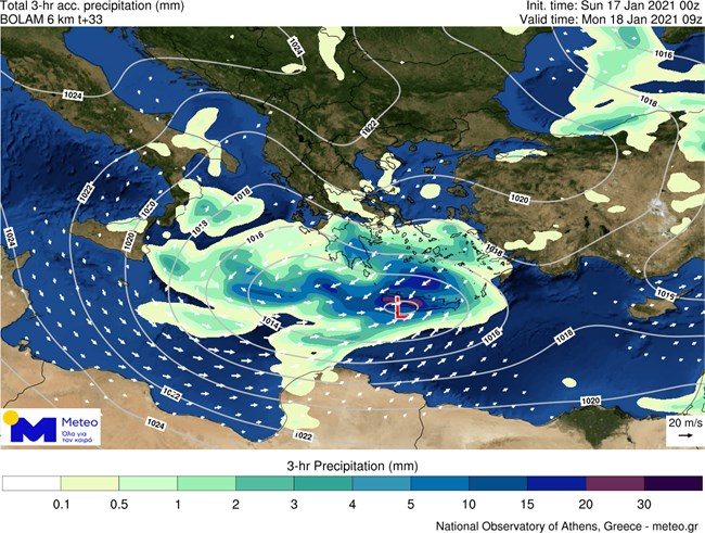 Πρόκειται για την τρίτη φάση της κακοκαιρίας “Λέανδρος”, η οποία θα έχει ως κύρια χαρακτηριστικά τις πυκνές κατά τόπους χιονοπτώσεις στα κεντρικά και νότια ηπειρωτικά και στα ορεινά της Κρήτης καθώς και τις ισχυρές βροχοπτώσεις στις νότιες νησιωτικές και παράκτιες περιοχές. Ιδιαίτερα στα δυτικά της Κρήτης υπάρχει πιθανότητα χαλαζοπτώσεων. Παράλληλα οι πολύ χαμηλές θερμοκρασίες θα διατηρηθούν, ενώ οι άνεμοι στο Νότιο Αιγαίο θα φτάνουν τα 8 και κατά τόπους τα 9 μποφόρ.