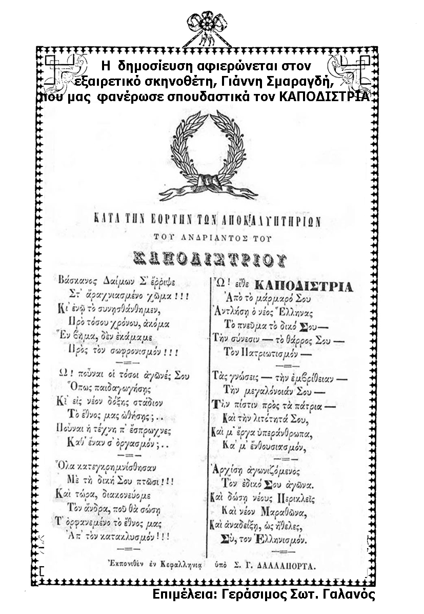 Η δημοσίευση αφιερώνεται ολόψυχα, κι ας μην τον γνωρίζω, στον εξαιρετικό σκηνοθέτη Ιωάννη Σμαραγδή, που μας φανερώνει (συνεχώς) σπουδαστικά, μελετητικά και γνήσια πατριωτικά με την ταινία του, το μέγεθος του μεγάλου Διπλωμάτη και Πολιτικού, Ιωάννη Καποδίστρια.