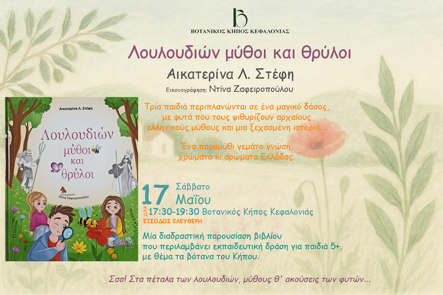 Το Σάββατο 17 Μαΐου θα έχουμε την χαρά να υποδεχτούμε την συγγραφέα στο Βοτανικό Κήπο Κεφαλονιάς και να μάθουμε περισσότερα για το βιβλίο της. Με την παρουσία του θα μας τιμήσει ο Καθηγητής Ανατομίας Φυτών του ΕΚΠΑ κύριος Νίκος Χριστοδουλάκης ενώ την διαδραστική παρουσίαση του βιβλίου, που όλοι μαζί θα δημιουργήσουμε, θα συντονίσει η Επιμελήτρια του Κήπου Εύη Ματιάτου.