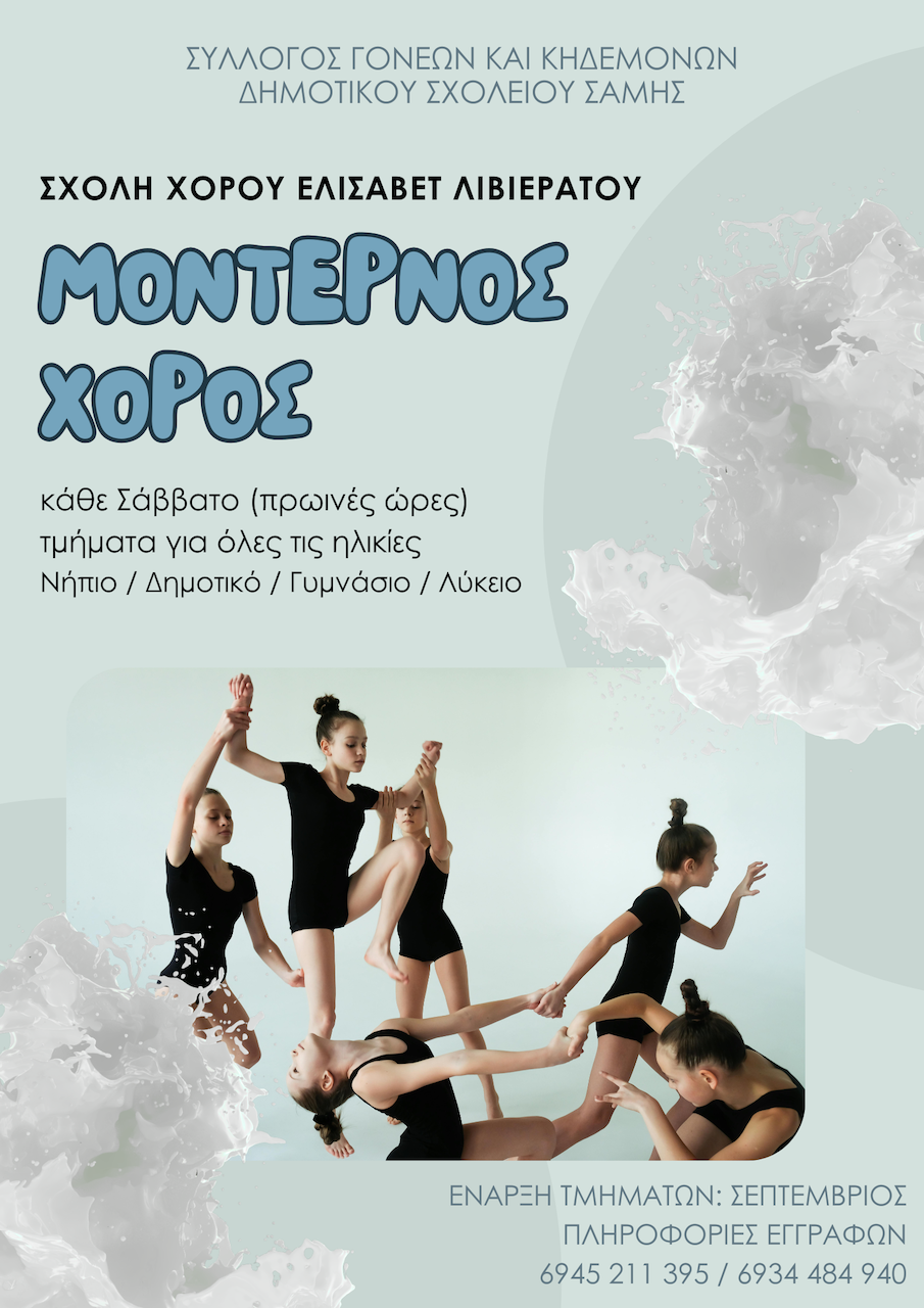 Ο Σύλλογος Γονέων και Κηδεμόνων Δημοτικού Σχολείου Σάμης σε συνεργασία με την αναγνωρισμένη από το Κράτος, Σχολή Χορού Ελισάβετ Λιβιεράτου, διοργανώνει τμήμα Μοντέρνου Χορού για όλες τις ηλικίες (Νήπιο, Δημοτικό, Γυμνάσιο, Λύκειο). Τα μαθήματα θα ξεκινήσουν τον Σεπτέμβριο και θα πραγματοποιούνται στη Σάμη, κάθε Σάββατο, πρωινές ώρες.