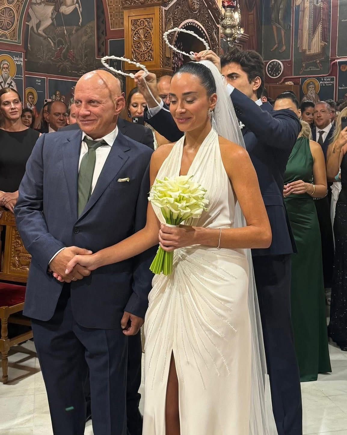 Η νύφη, με μια κομψή και αέρινη δημιουργία του σχεδιαστή Χρήστου Κωσταρέλου, έκλεψε τις εντυπώσεις με την απλότητα και την φινέτσα της. Το λευκό εξώπλατο φόρεμα με το εντυπωσιακό σκίσιμο και το μακρύ πέπλο της προσέδωσε μια αρχοντική αίγλη.