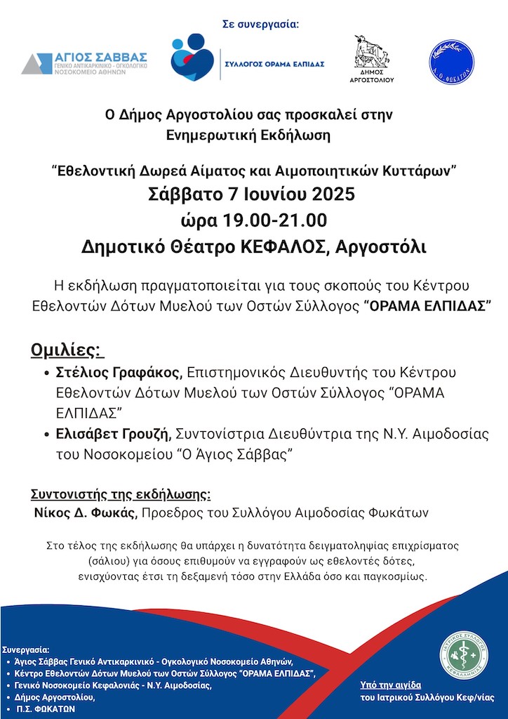 Ο Δήμος Αργοστολίου, σε συνεργασία με το Κέντρο Εθελοντών Δοτών Μυελού των Οστών “ΟΡΑΜΑ ΕΛΠΙΔΑΣ”, το Γενικό Αντικαρκινικό – Ογκολογικό Νοσοκομείο Αθηνών ‘’Άγιος Σάββας’’, το Γενικό Νοσοκομείο Κεφαλονιάς, και τον Πολιτιστικό Σύλλογο Φωκάτων, σας προσκαλεί στην ενημερωτική εκδήλωση “Εθελοντική Δωρεά Αίματος και Αιμοποιητικών Κυττάρων”.