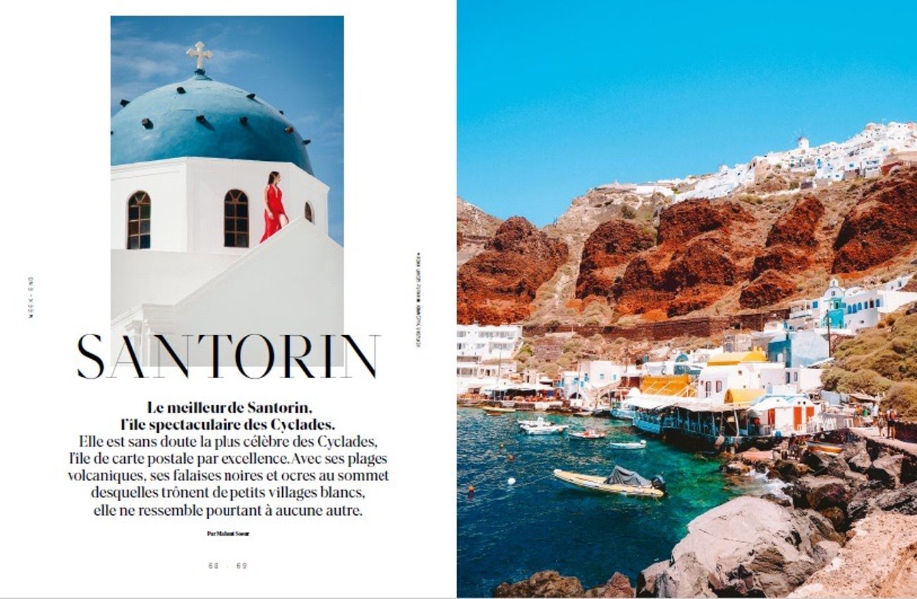 Το 6σέλιδο αφιέρωμα με τίτλο «Τα καλύτερα της Σαντορίνης – Το εντυπωσιακό νησί των Κυκλάδων» παρουσιάζει όλες τις πτυχές πολυτελείας, ευεξίας και ευ ζην που προσφέρει το νησί, αλλά και την εξαιρετική γαστρονομία με τη μοναδική ποικιλία των κρασιών της, που την καθιστούν γη γεύσεων για το γαλλικό κοινό.