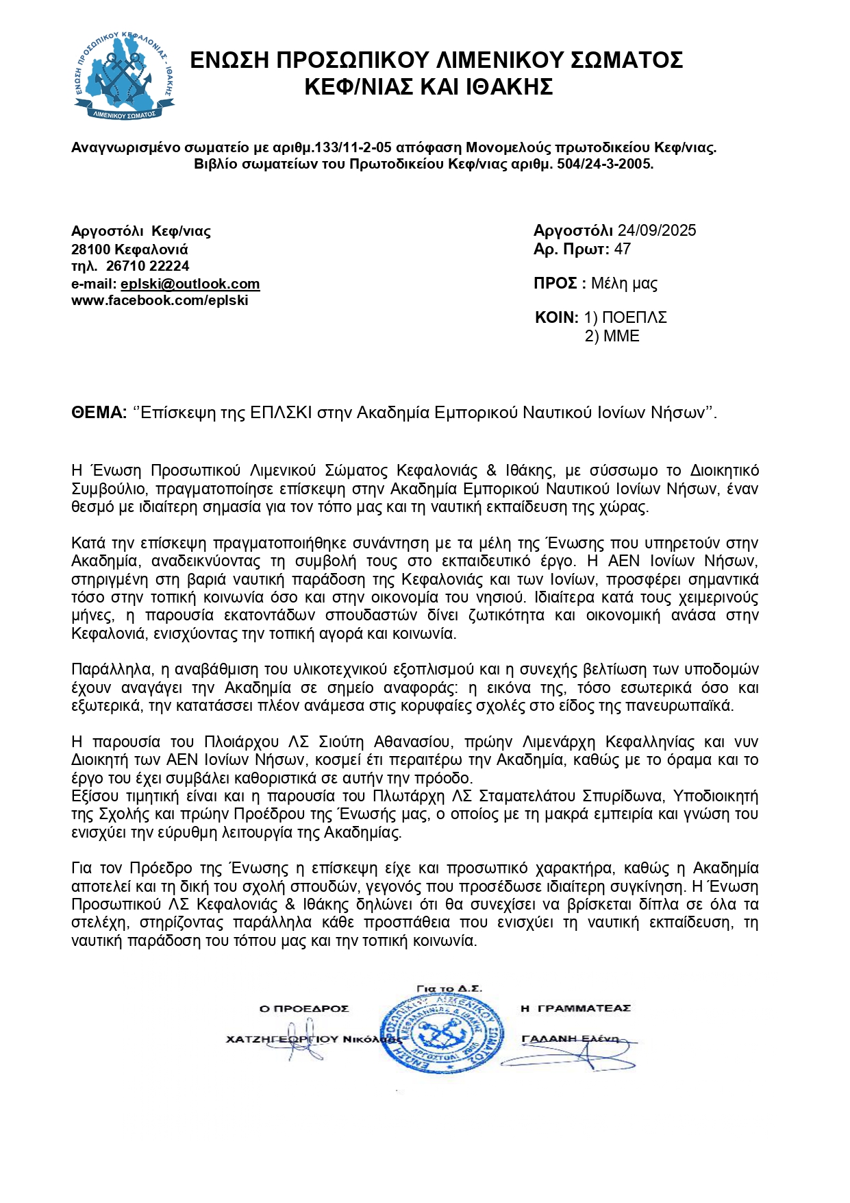 Επίσκεψη της ΕΠΛΣΚΙ στην Ακαδημία Εμπορικού Ναυτικού Ιονίων Νήσων
