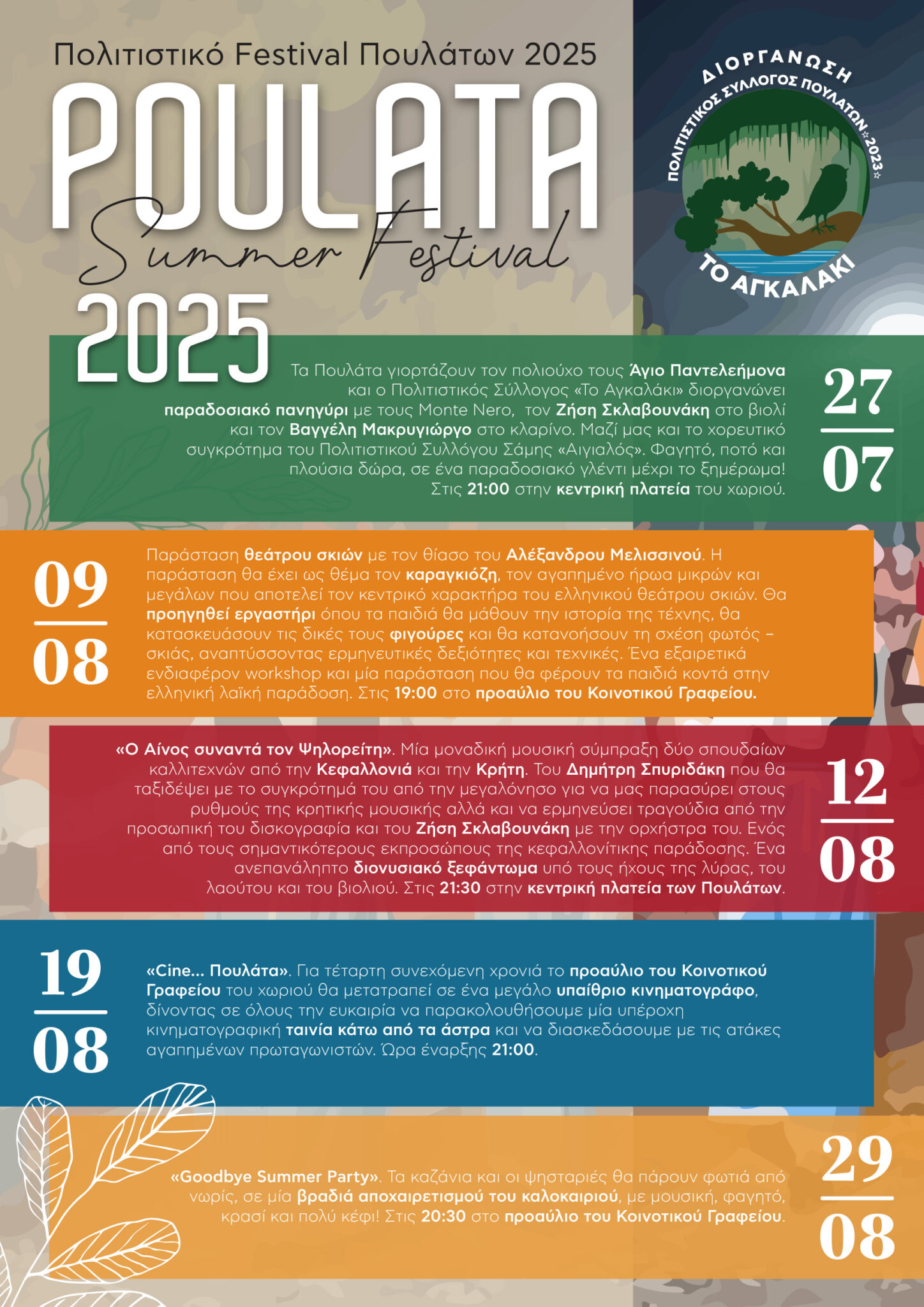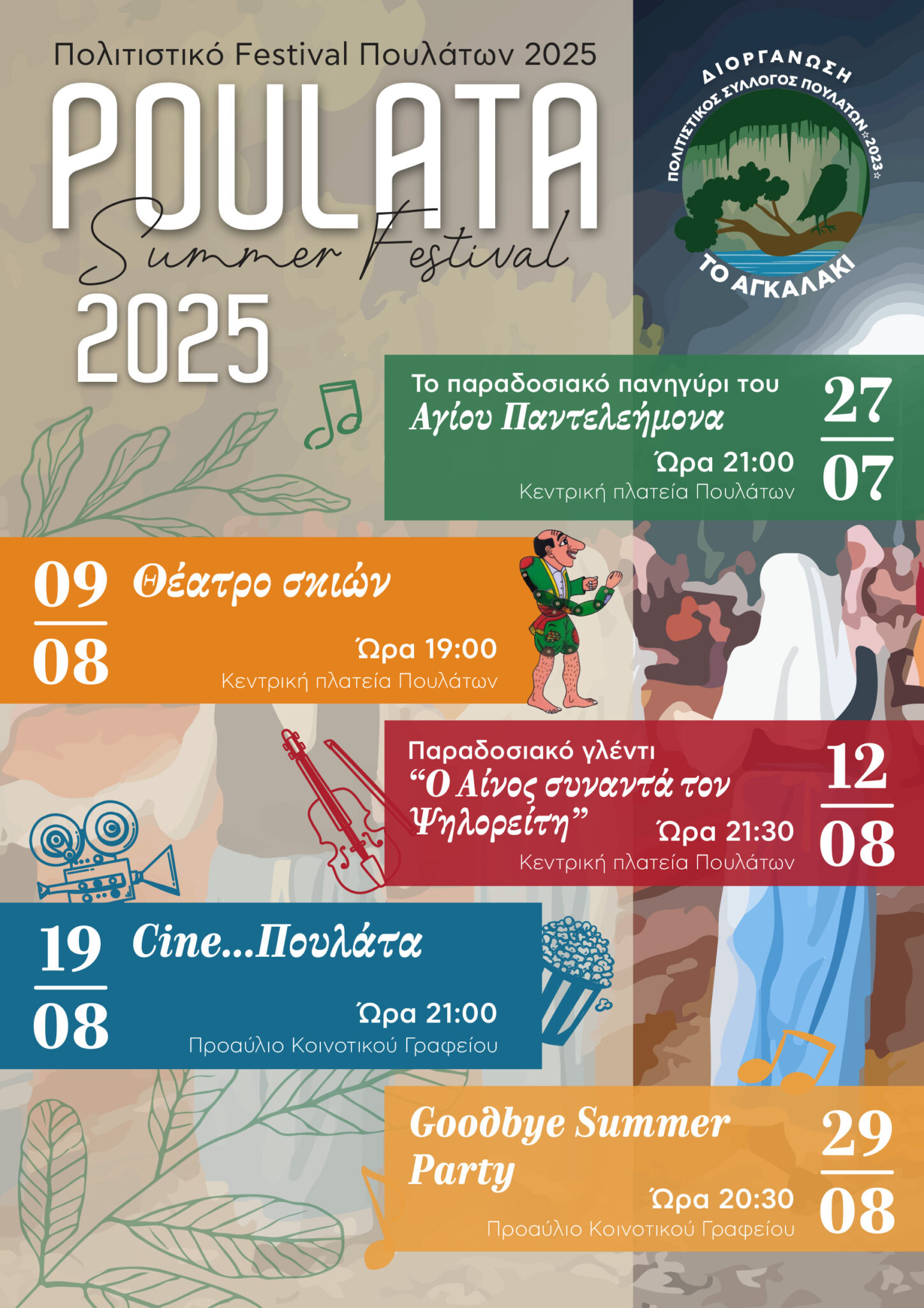 Το δεύτερο “Poulata Summer Festival” είναι γεγονός! Ειδικότερα, ο Πολιτιστικός Σύλλογος «Το Αγκαλάκι» για δεύτερη συνεχή χρονιά έχει προγραμματίσει μία σειρά εκδηλώσεων, που στόχο έχουν να διασκεδάσουν τους κατοίκους και τους επισκέπτες των Πουλάτων, με τρόπο που μόνο ο πολιτισμός με την ευρύτερη έννοιά του μπορεί!
