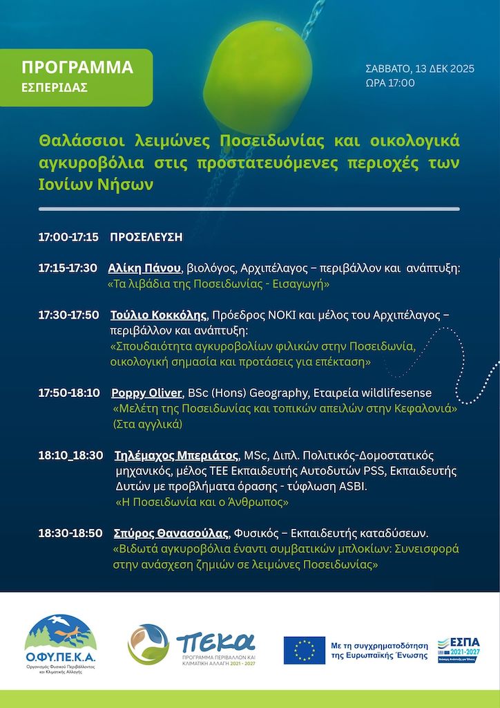 Το Παράρτημα Αργοστολίου της Μονάδας Διαχείρισης Εθνικών Πάρκων Ζακύνθου, Αίνου & Προστατευόμενων Περιοχών Ιονίων Νήσων του Οργανισμού Φυσικού Περιβάλλοντος και Κλιματικής Αλλαγής (ΟΦΥΠΕΚΑ), διοργανώνει εσπερίδα με τίτλο: «Θαλάσσιοι λειμώνες Ποσειδωνίας και οικολογικά αγκυροβόλια στις προστατευόμενες περιοχές των Ιονίων Νήσων» στο Κέντρο Περιβαλλοντικής Ενημέρωσης Κουτάβου στο Αργοστόλι, το Σάββατο 13 Δεκεμβρίου 2025 και ώρα 17.00.