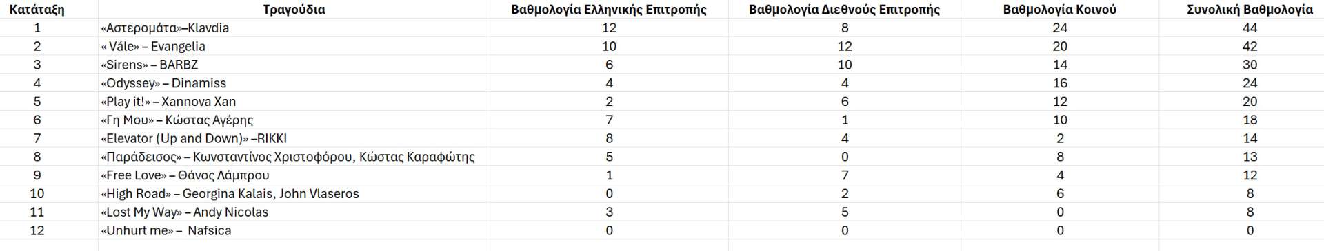 Η ΕΡΤ ανακοινώνει την αναλυτική βαθμολογία του κοινού, καθώς και των δύο κριτικών επιτροπών, από τον συνδυασμό των οποίων αναδείχθηκε νικήτρια του Εθνικού Τελικού η Klavdia, με το τραγούδι «Αστερομάτα» και θα εκπροσωπήσει την Ελλάδα στον 69o Διαγωνισμό Τραγουδιού της Eurovision, που θα διεξαχθεί στη Βασιλεία της Ελβετίας, από 13 έως 17 Μαΐου 2025.