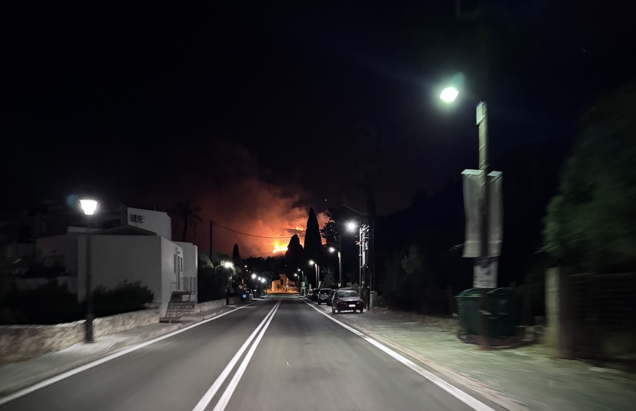 H φωτιά όπως φαινόταν στις 3.05 το πρωί στη Λαγκάδα από το δρόμο προς το κοιμητήριο του Δραπάνου