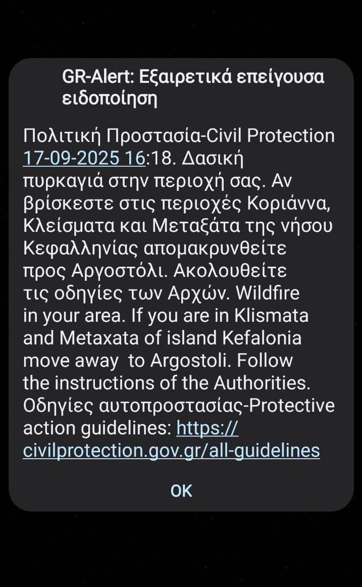 Παράλληλα, μέσω του αριθμού έκτακτης ανάγκης 112 εστάλη μήνυμα στους κατοίκους των Μεταξάτων, των Κλεισμάτων και των Κοριάννων, καλώντας τους να κινηθούν άμεσα προς το Αργοστόλι.