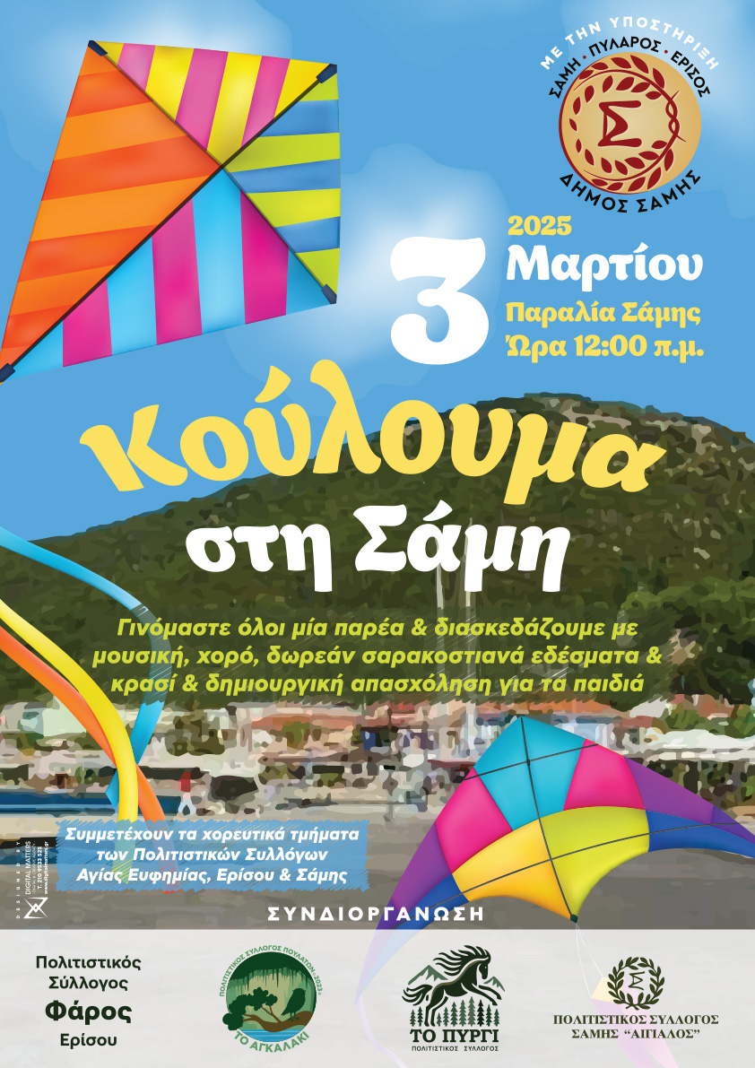 Η εκδήλωση υπόσχεται μια μοναδική εμπειρία για όλους, με παραδοσιακή μουσική, χορό, δωρεάν σαρακοστιανά εδέσματα, κρασί και δημιουργικές δραστηριότητες για τα παιδιά. Οι Πολιτιστικοί Σύλλογοι Αγίας Ευφημίας, Ερίσου και Σάμης θα πλαισιώσουν την ημέρα με χορευτικά τμήματα, προσφέροντας ένα θέαμα γεμάτο παράδοση και κέφι.
